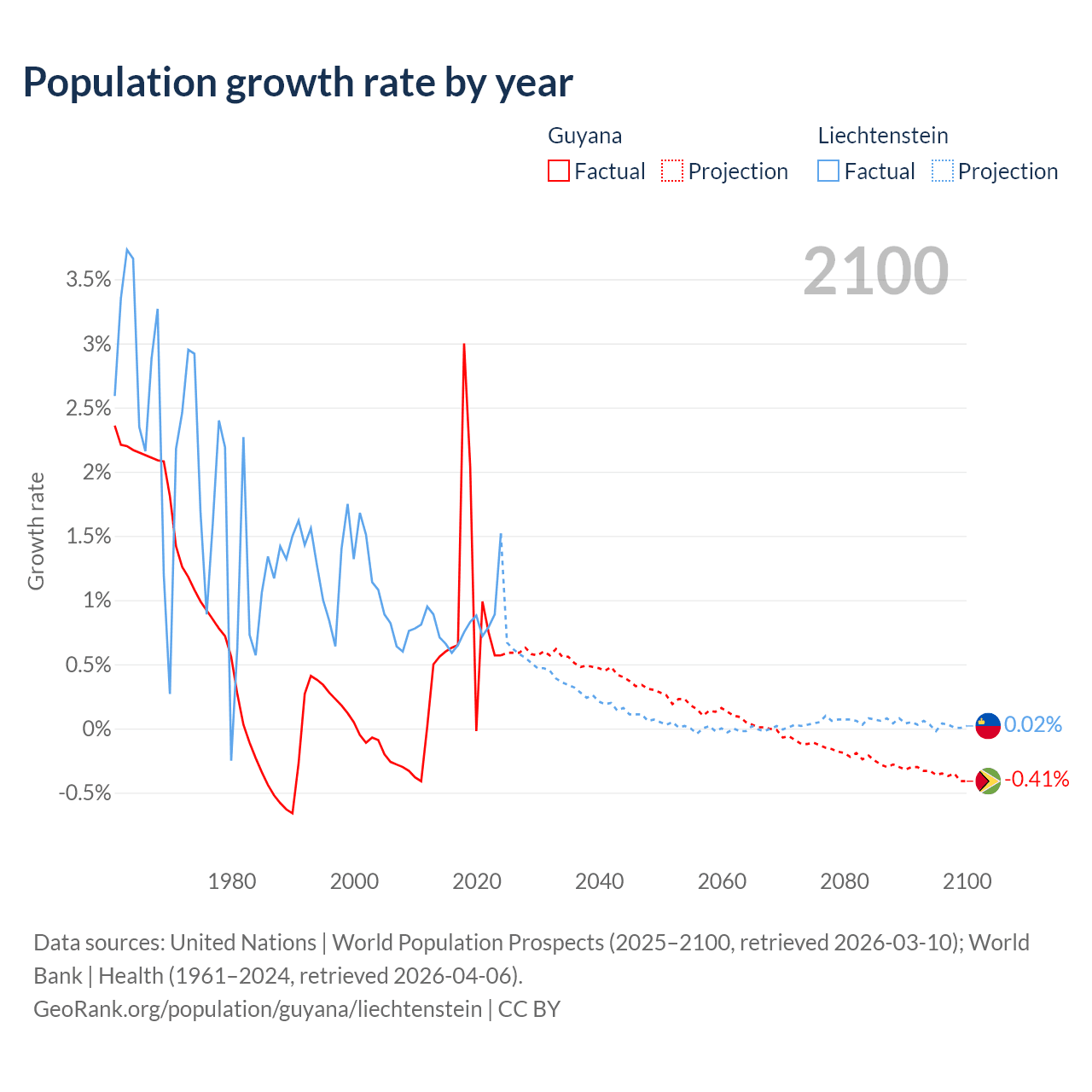 - For the last 10 years, Guyana has had an average growth rate of +0.94% per year vs +0.82% in Liechtenstein.
