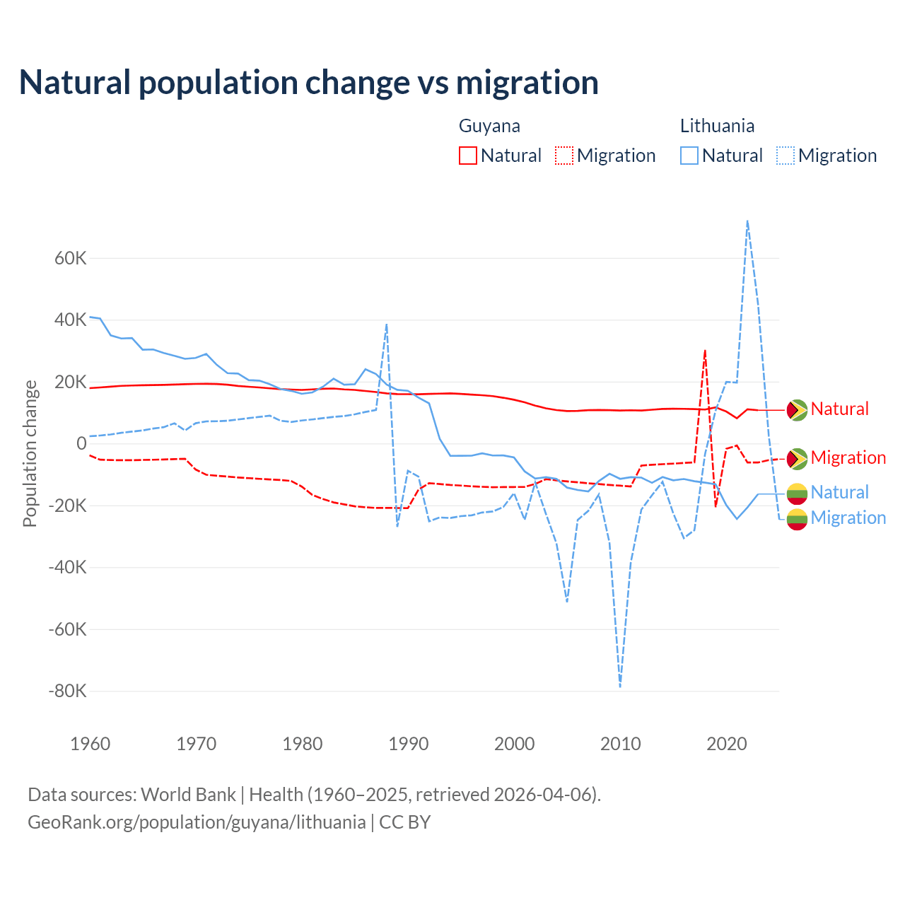 Over the last 10 years, 77.7% of the population change in Guyana is from natural causes (a gain of 107,419 people) and 22.3% is from migration (a loss of 30,797 people). In Lithuania 68.7% is from natural causes (a loss of 153,859 people) and 31.3% is from migration (a gain of 70,196 people).