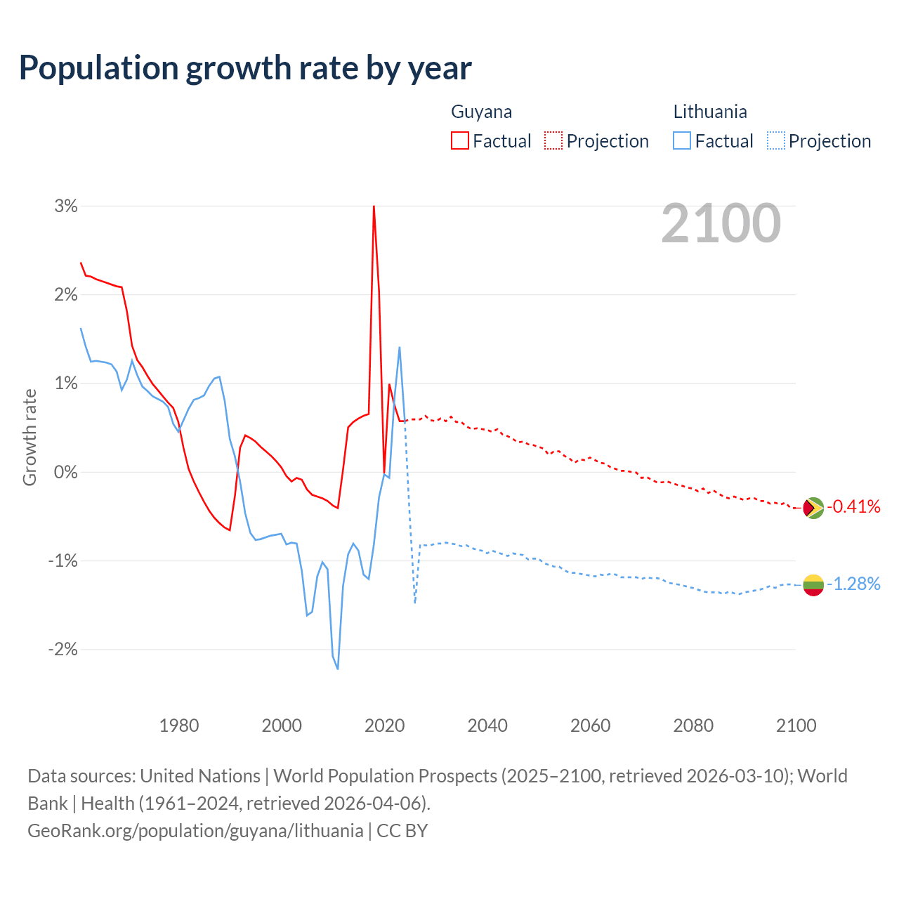 Guyana vs Lithuania: population by year and forecast