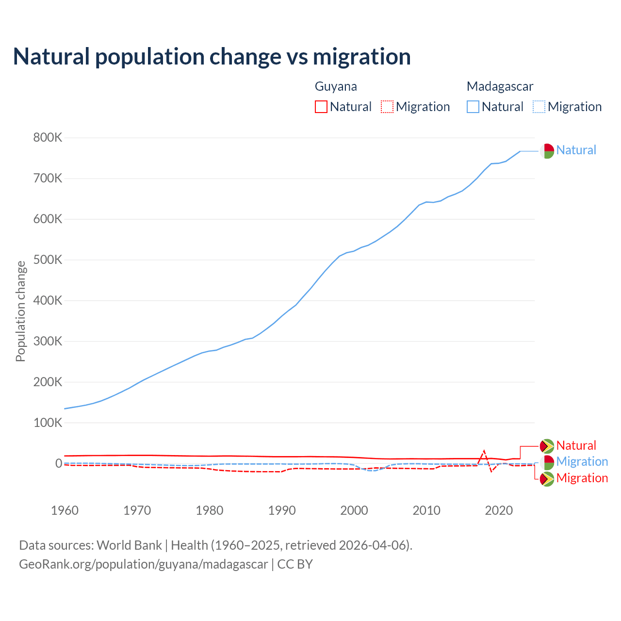 Over the last 10 years, 77.7% of the population change in Guyana is from natural causes (a gain of 107,419 people) and 22.3% is from migration (a loss of 30,797 people). In Madagascar 99.7% is from natural causes (a gain of 7,165,578 people) and 0.31% is from migration (a loss of 22,384 people).