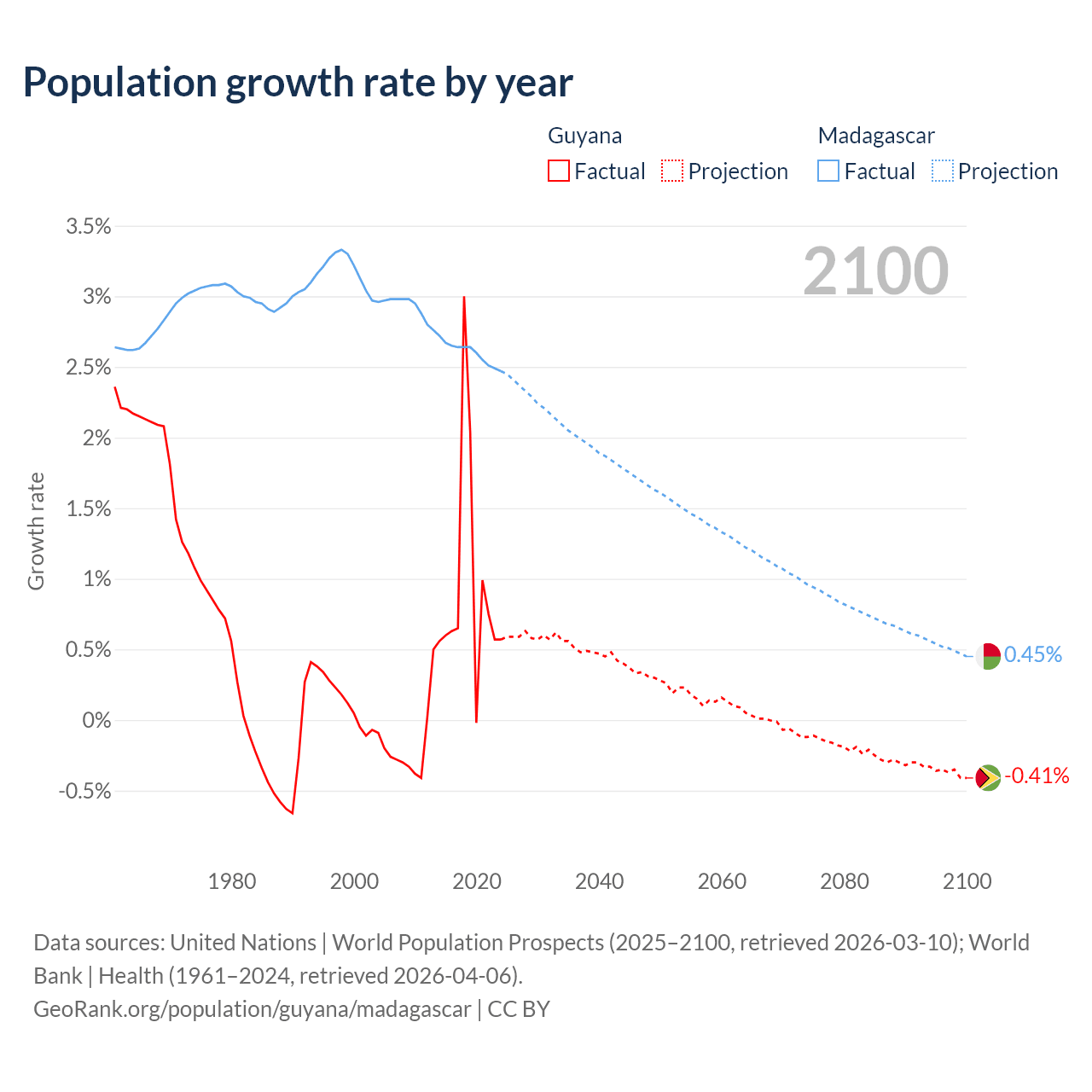 - For the last 10 years, Guyana has had an average growth rate of +0.94% per year vs +2.6% in Madagascar.