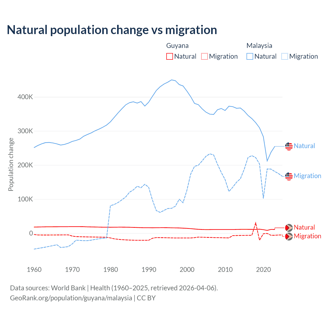 Over the last 10 years, 77.7% of the population change in Guyana is from natural causes (a gain of 107,419 people) and 22.3% is from migration (a loss of 30,797 people). In Malaysia 61.7% is from natural causes (a gain of 3,029,648 people) and 38.3% is from migration (a gain of 1,882,159 people).