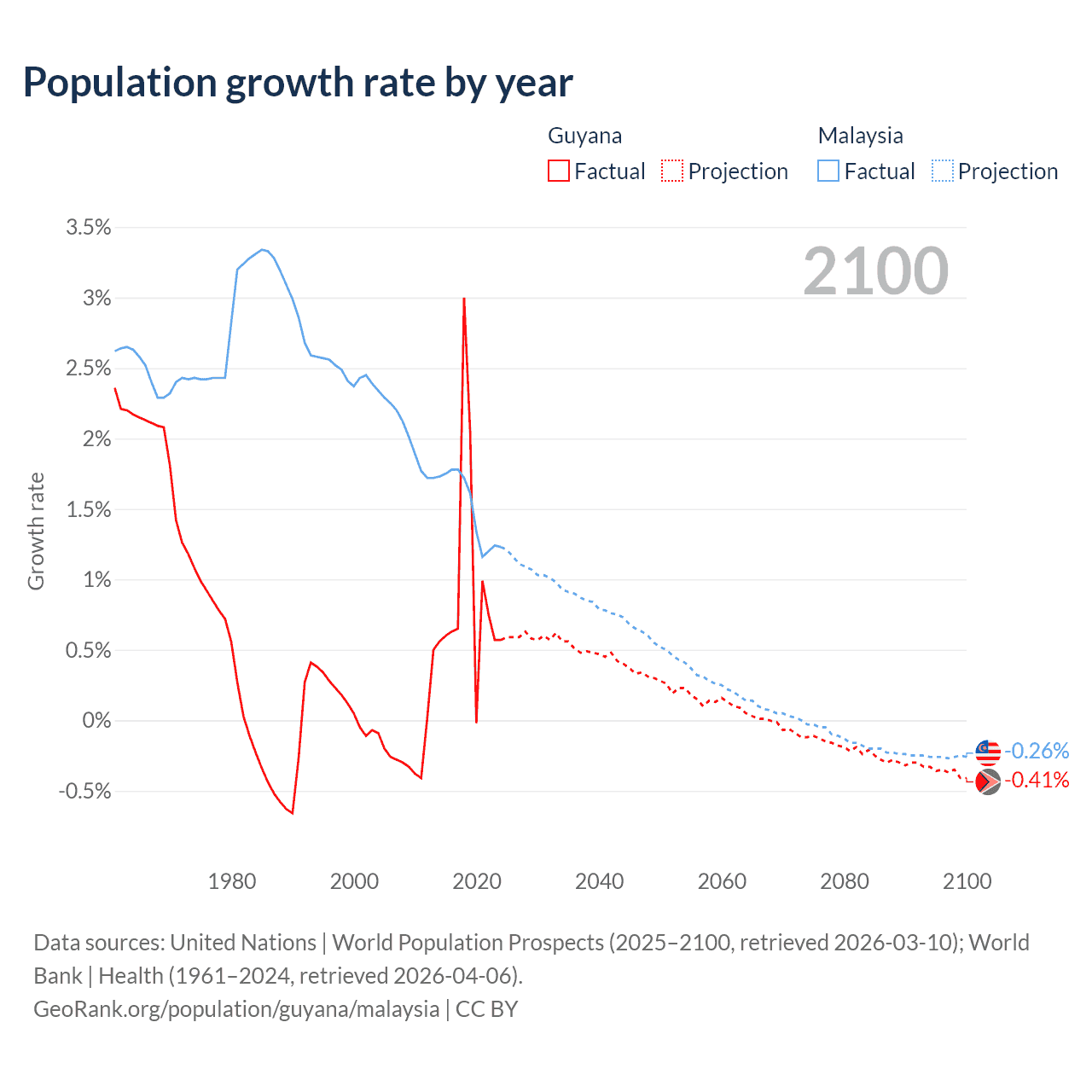 - For the last 10 years, Guyana has had an average growth rate of +0.94% per year vs +1.5% in Malaysia.