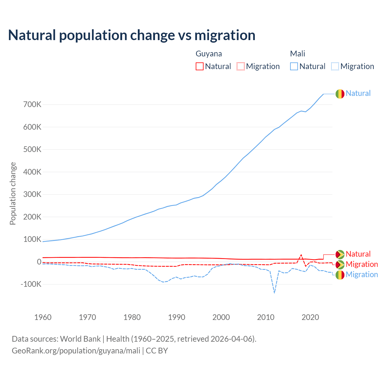 Over the last 10 years, 77.7% of the population change in Guyana is from natural causes (a gain of 107,419 people) and 22.3% is from migration (a loss of 30,797 people). In Mali 94.9% is from natural causes (a gain of 6,749,473 people) and 5.13% is from migration (a loss of 365,292 people).