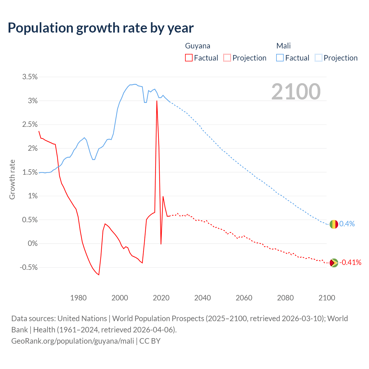 - For the last 10 years, Guyana has had an average growth rate of +0.94% per year vs +3.12% in Mali.