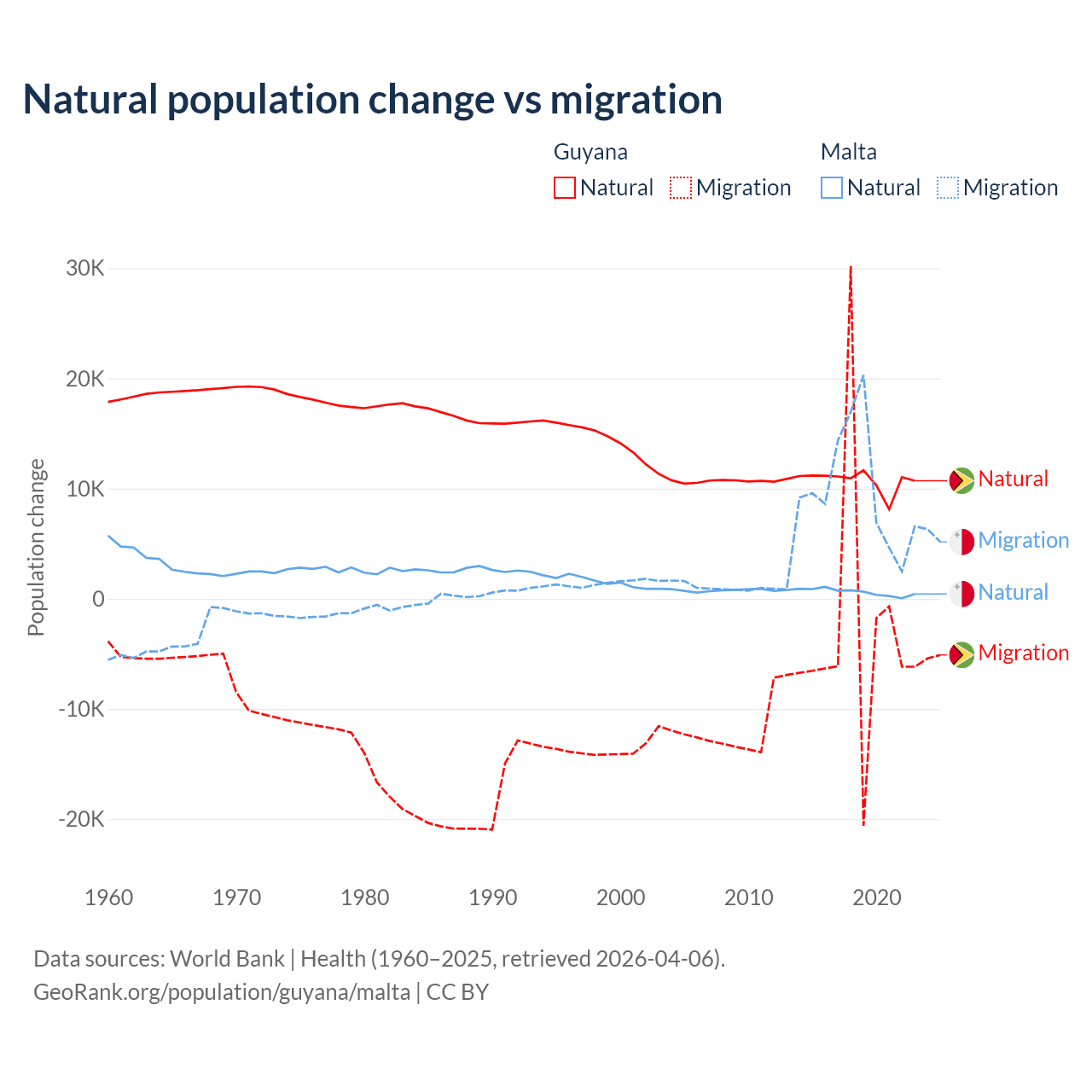 Over the last 10 years, 77.7% of the population change in Guyana is from natural causes (a gain of 107,419 people) and 22.3% is from migration (a loss of 30,797 people). In Malta 5.84% is from natural causes (a gain of 6,181 people) and 94.2% is from migration (a gain of 99,652 people).
