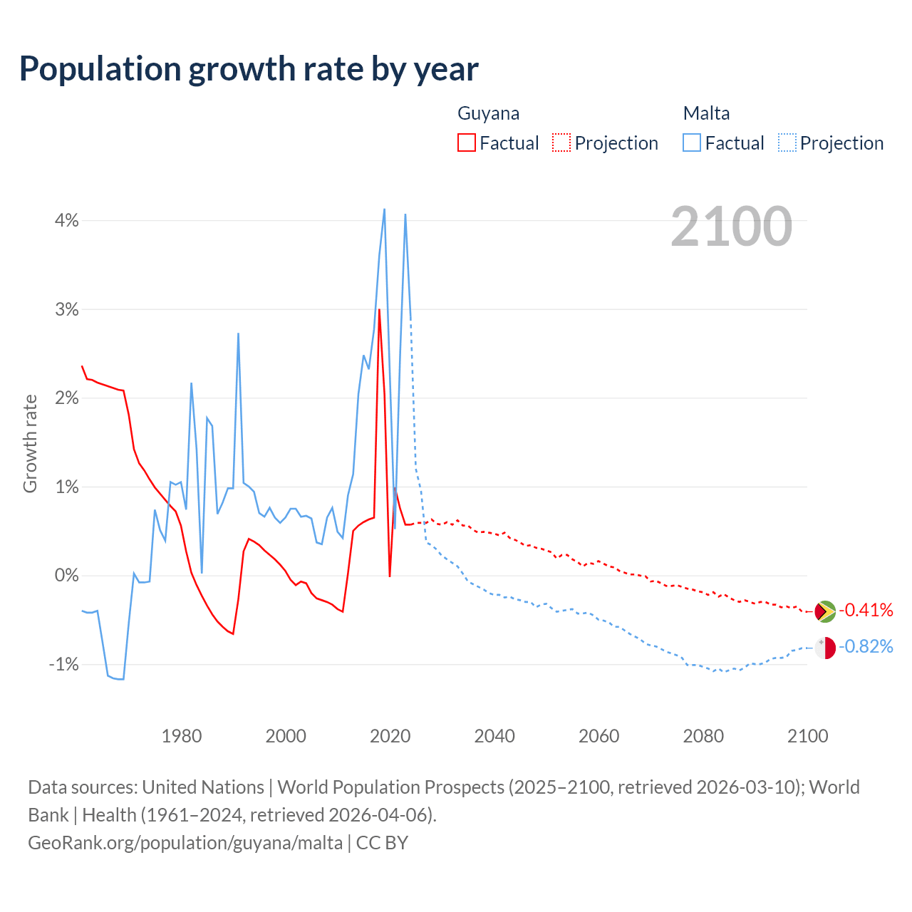 - For the last 10 years, Guyana has had an average growth rate of +0.94% per year vs +2.69% in Malta.