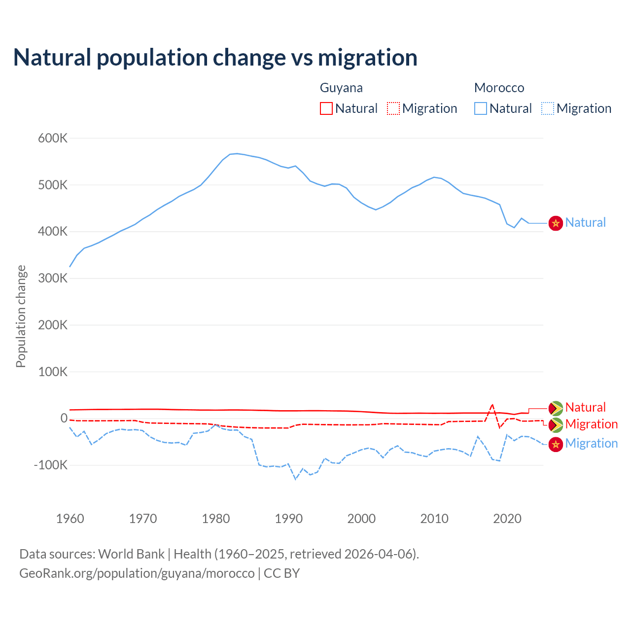 Over the last 10 years, 77.7% of the population change in Guyana is from natural causes (a gain of 107,419 people) and 22.3% is from migration (a loss of 30,797 people). In Morocco 88.3% is from natural causes (a gain of 4,495,223 people) and 11.7% is from migration (a loss of 594,083 people).