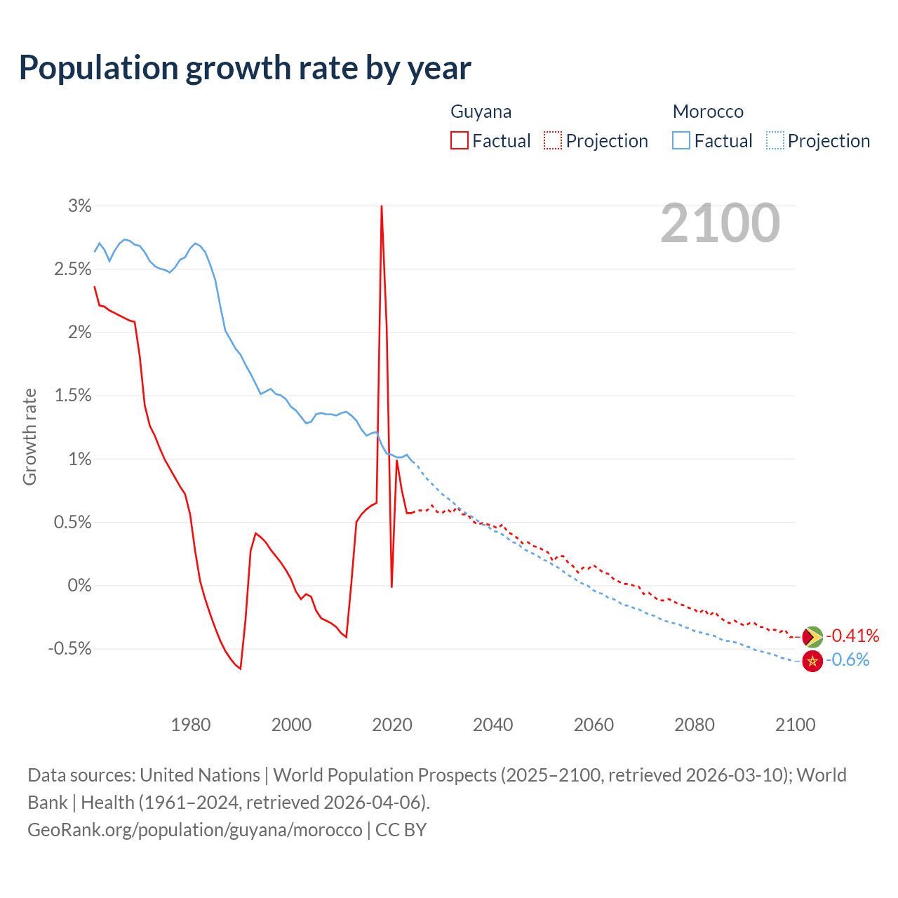 - For the last 10 years, Guyana has had an average growth rate of +0.94% per year vs +1.09% in Morocco.