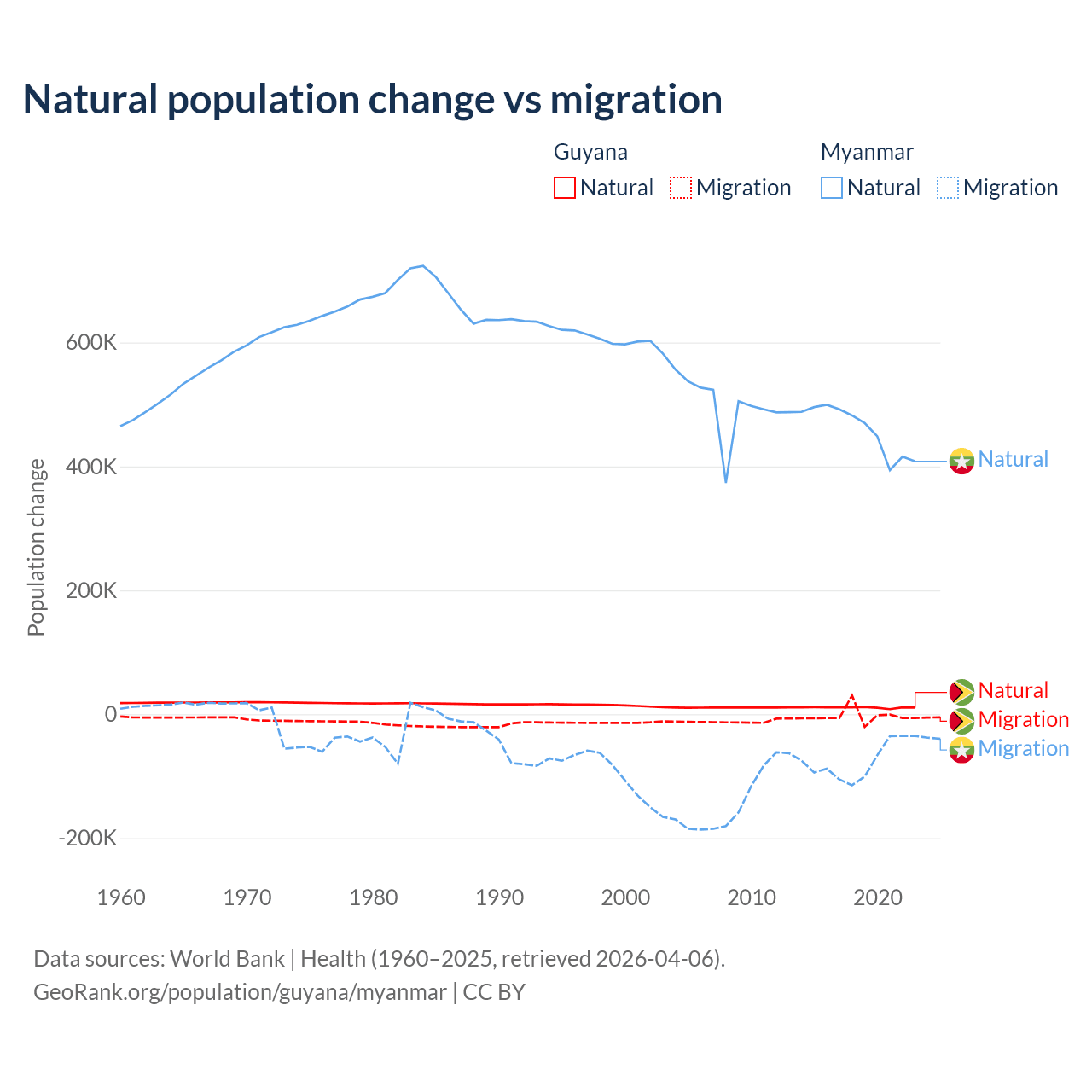 Over the last 10 years, 77.7% of the population change in Guyana is from natural causes (a gain of 107,419 people) and 22.3% is from migration (a loss of 30,797 people). In Myanmar 86% is from natural causes (a gain of 4,594,615 people) and 14% is from migration (a loss of 749,272 people).
