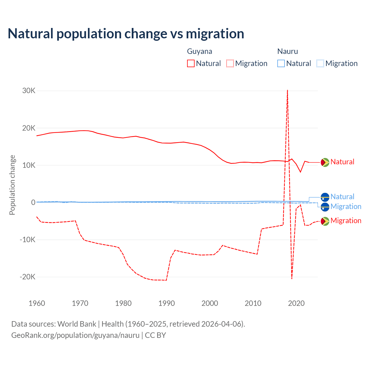 Over the last 10 years, 77.7% of the population change in Guyana is from natural causes (a gain of 107,419 people) and 22.3% is from migration (a loss of 30,797 people). In Nauru 66.2% is from natural causes (a gain of 2,590 people) and 33.8% is from migration (a loss of 1,320 people).