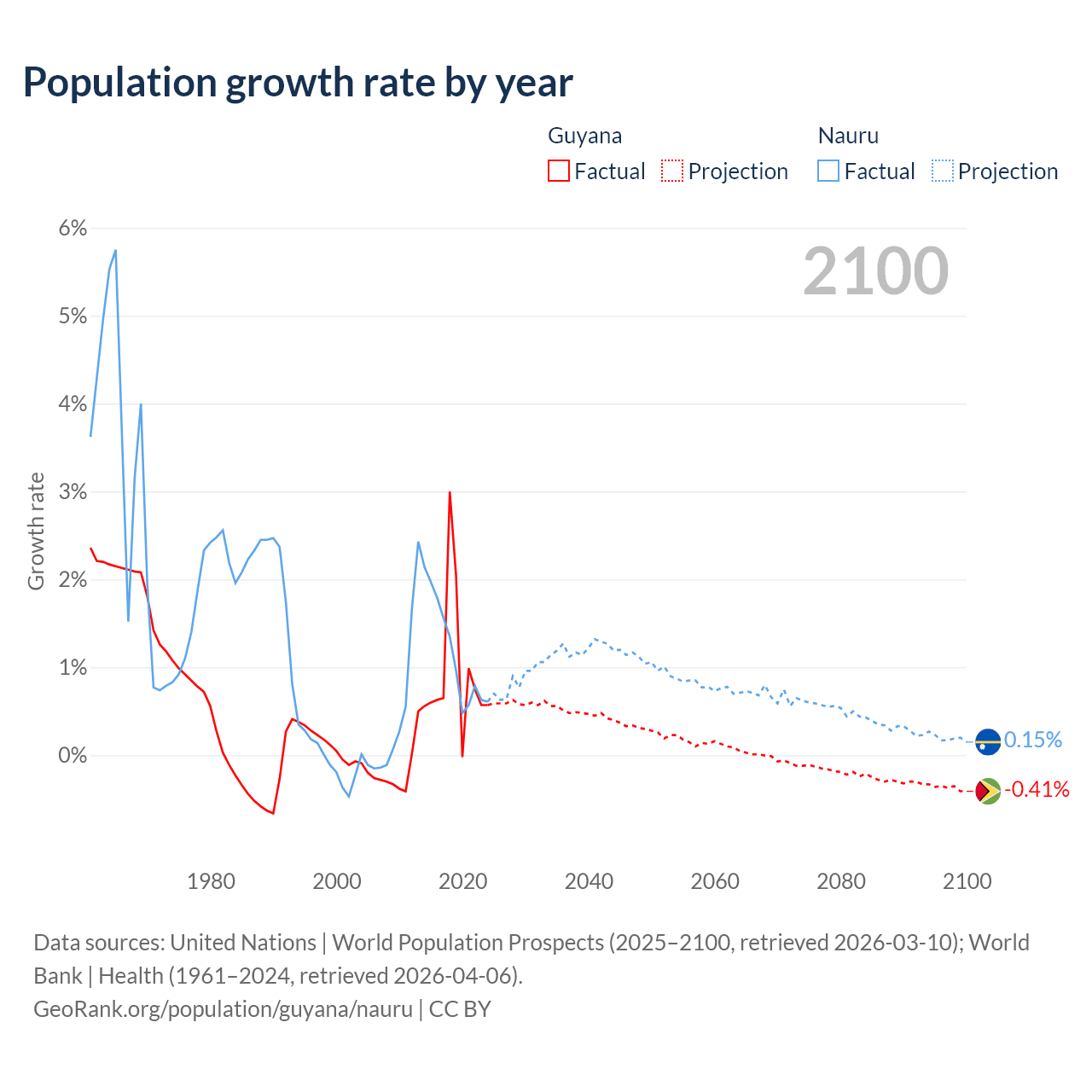 - For the last 10 years, Guyana has had an average growth rate of +0.94% per year vs +1.17% in Nauru.