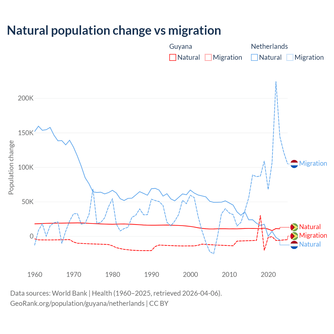 Over the last 10 years, 77.7% of the population change in Guyana is from natural causes (a gain of 107,419 people) and 22.3% is from migration (a loss of 30,797 people). In the Netherlands 11.8% is from natural causes (a gain of 134,554 people) and 88.2% is from migration (a gain of 1,006,495 people).