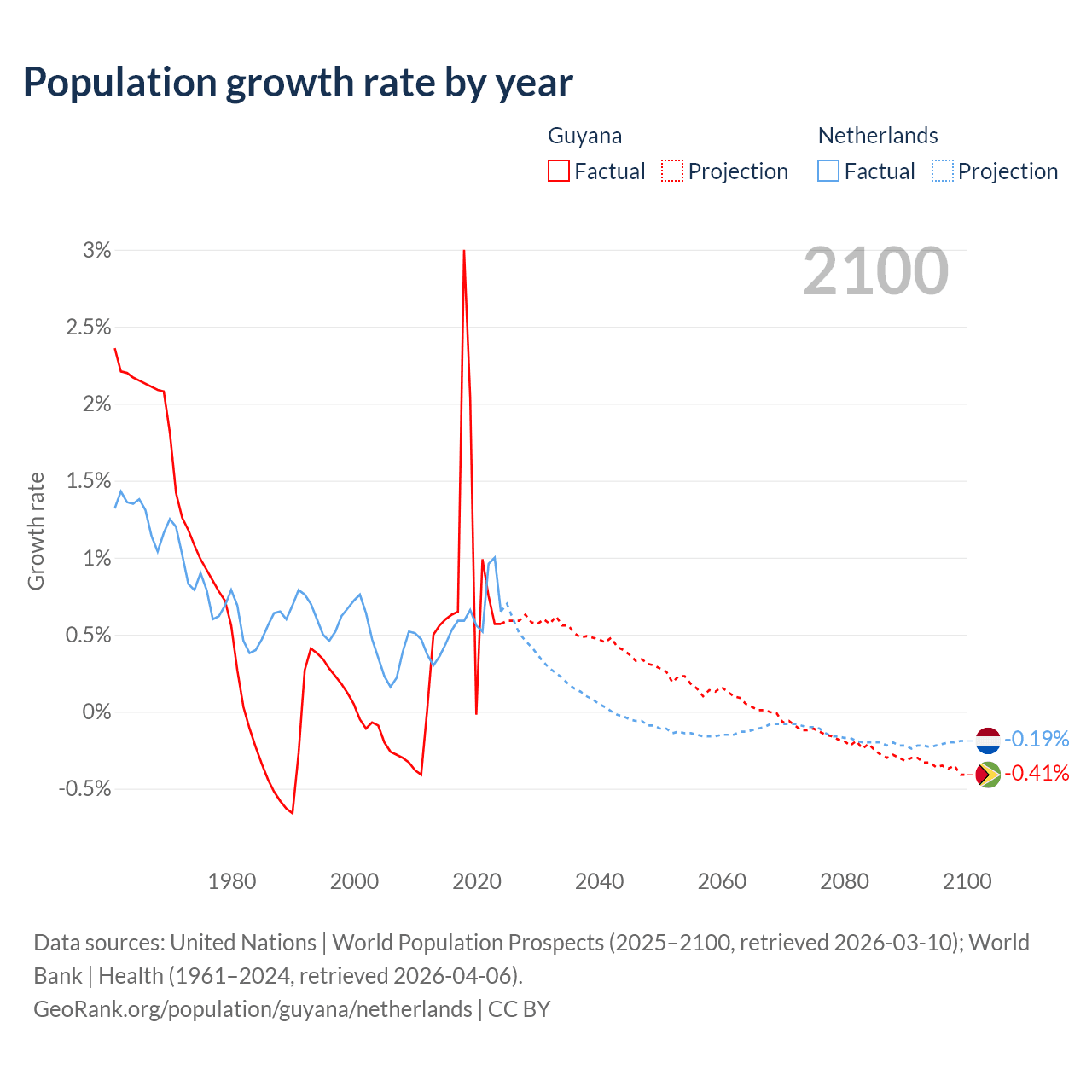 - For the last 10 years, Guyana has had an average growth rate of +0.94% per year vs +0.62% in the Netherlands.