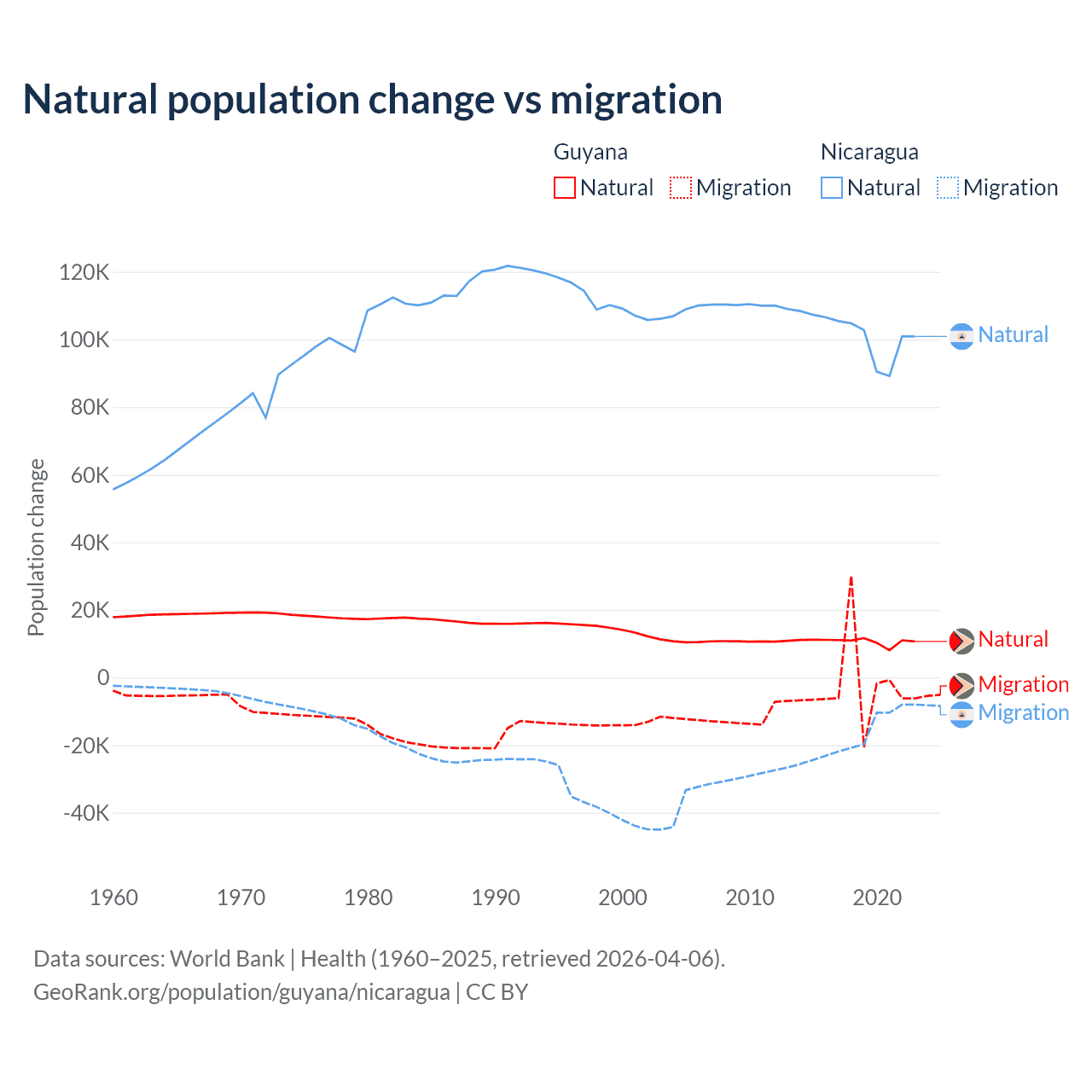 Over the last 10 years, 77.7% of the population change in Guyana is from natural causes (a gain of 107,419 people) and 22.3% is from migration (a loss of 30,797 people). In Nicaragua 85.5% is from natural causes (a gain of 1,017,084 people) and 14.5% is from migration (a loss of 172,078 people).