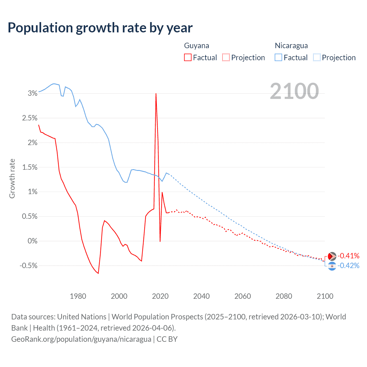 - For the last 10 years, Guyana has had an average growth rate of +0.94% per year vs +1.33% in Nicaragua.