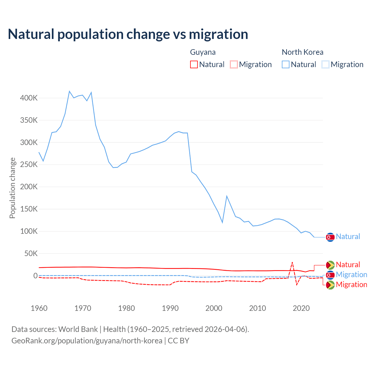 Over the last 10 years, 77.7% of the population change in Guyana is from natural causes (a gain of 107,419 people) and 22.3% is from migration (a loss of 30,797 people). In North Korea 97.7% is from natural causes (a gain of 1,097,372 people) and 2.33% is from migration (a loss of 26,227 people).