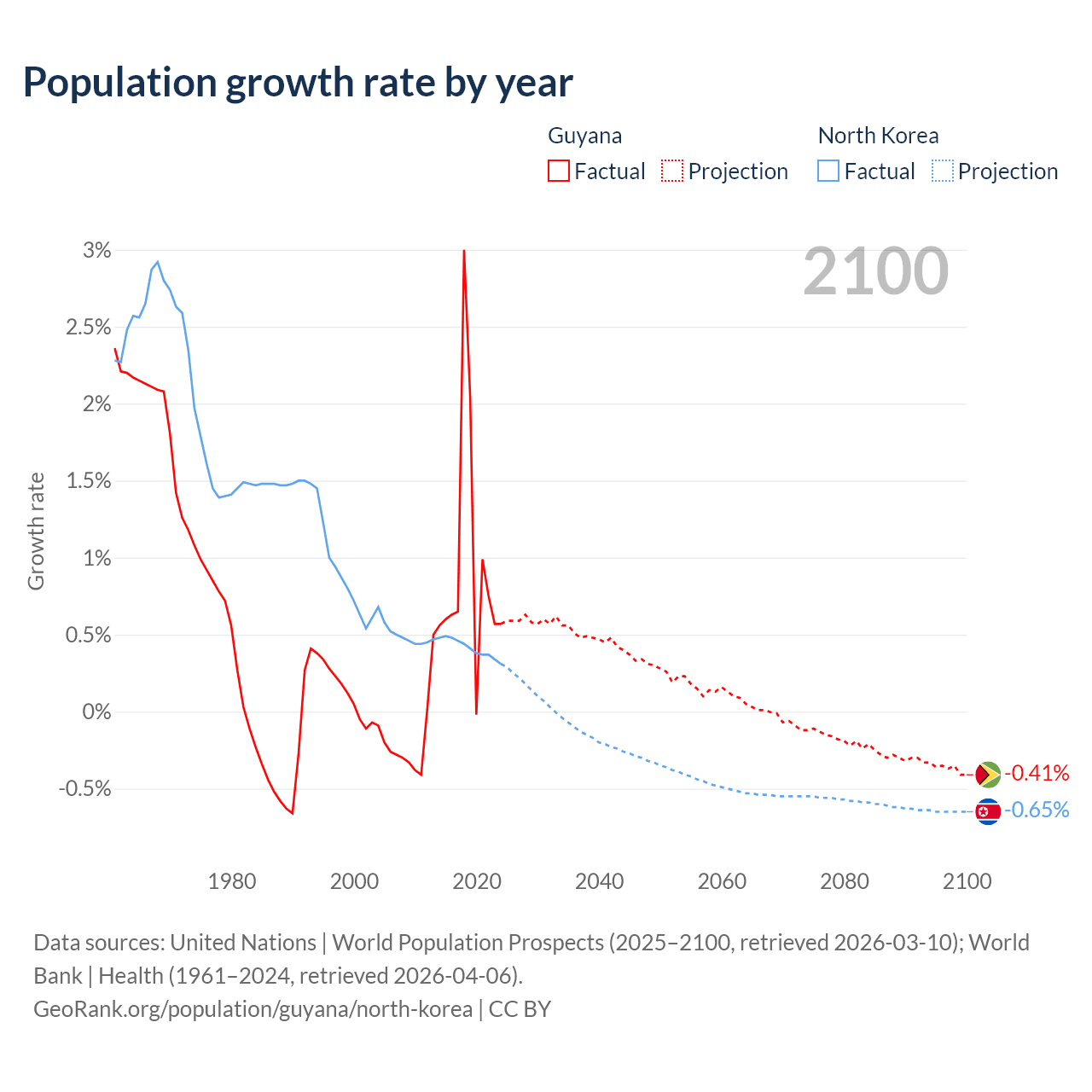 - For the last 10 years, Guyana has had an average growth rate of +0.94% per year vs +0.41% in North Korea.