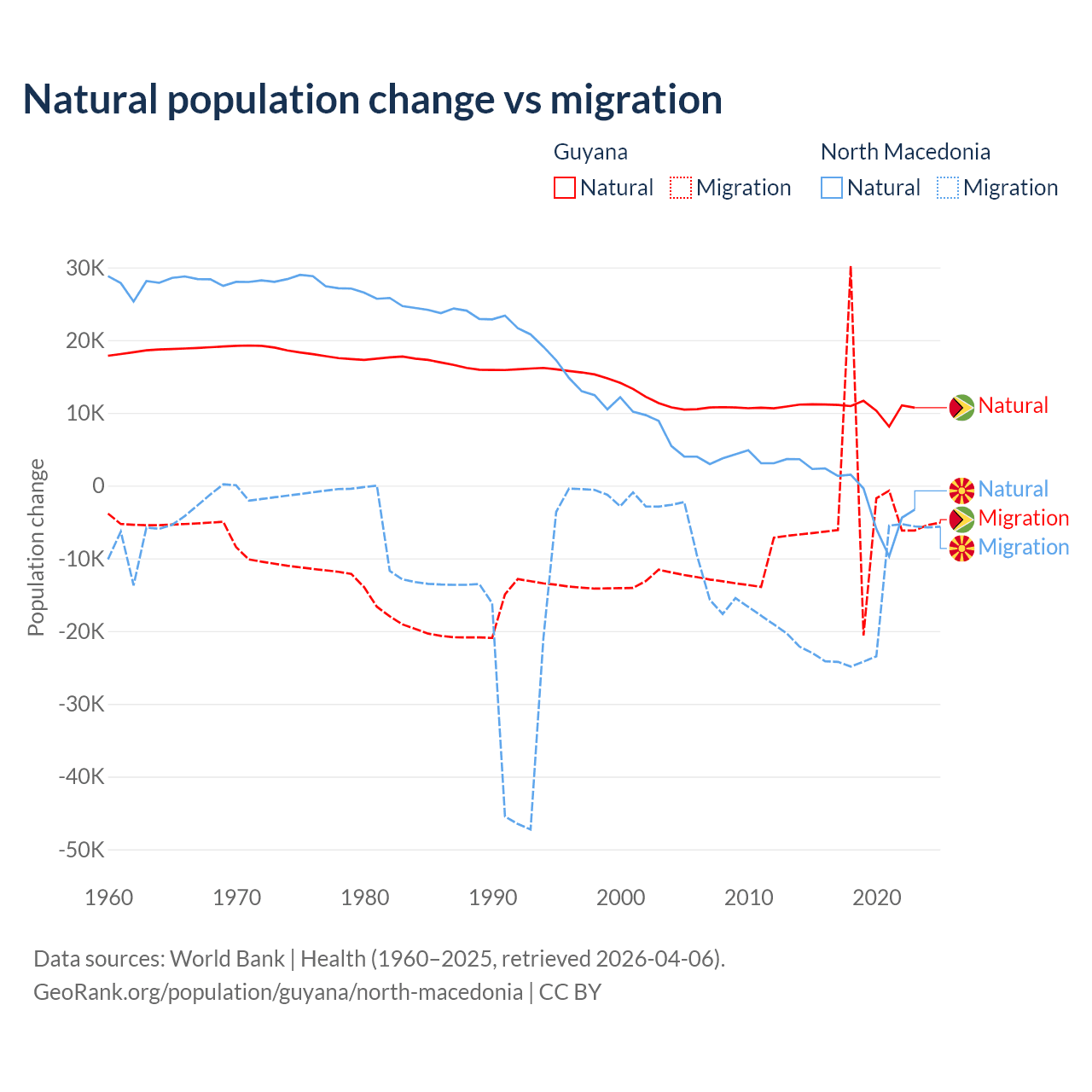Over the last 10 years, 77.7% of the population change in Guyana is from natural causes (a gain of 107,419 people) and 22.3% is from migration (a loss of 30,797 people). In North Macedonia 6.45% is from natural causes (a loss of 12,585 people) and 93.5% is from migration (a loss of 182,429 people).