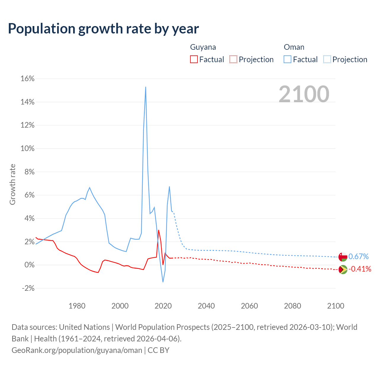 - For the last 10 years, Guyana has had an average growth rate of +0.94% per year vs +2.99% in Oman.