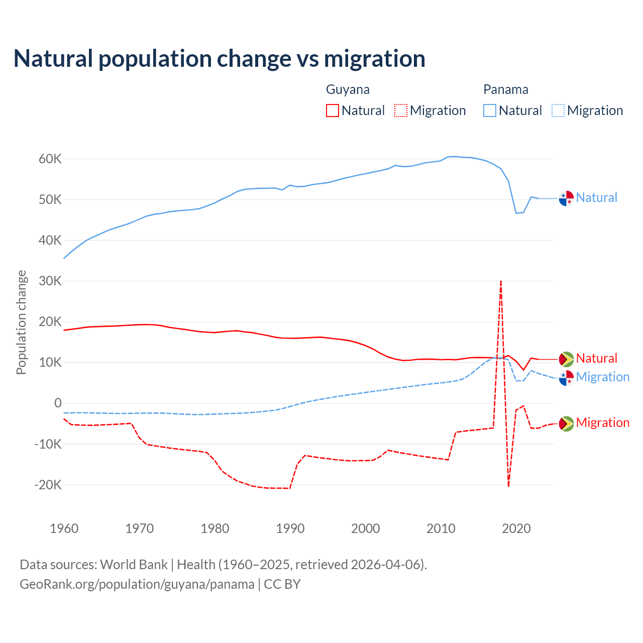 Over the last 10 years, 77.7% of the population change in Guyana is from natural causes (a gain of 107,419 people) and 22.3% is from migration (a loss of 30,797 people). In Panama 86.5% is from natural causes (a gain of 544,211 people) and 13.5% is from migration (a gain of 84,849 people).