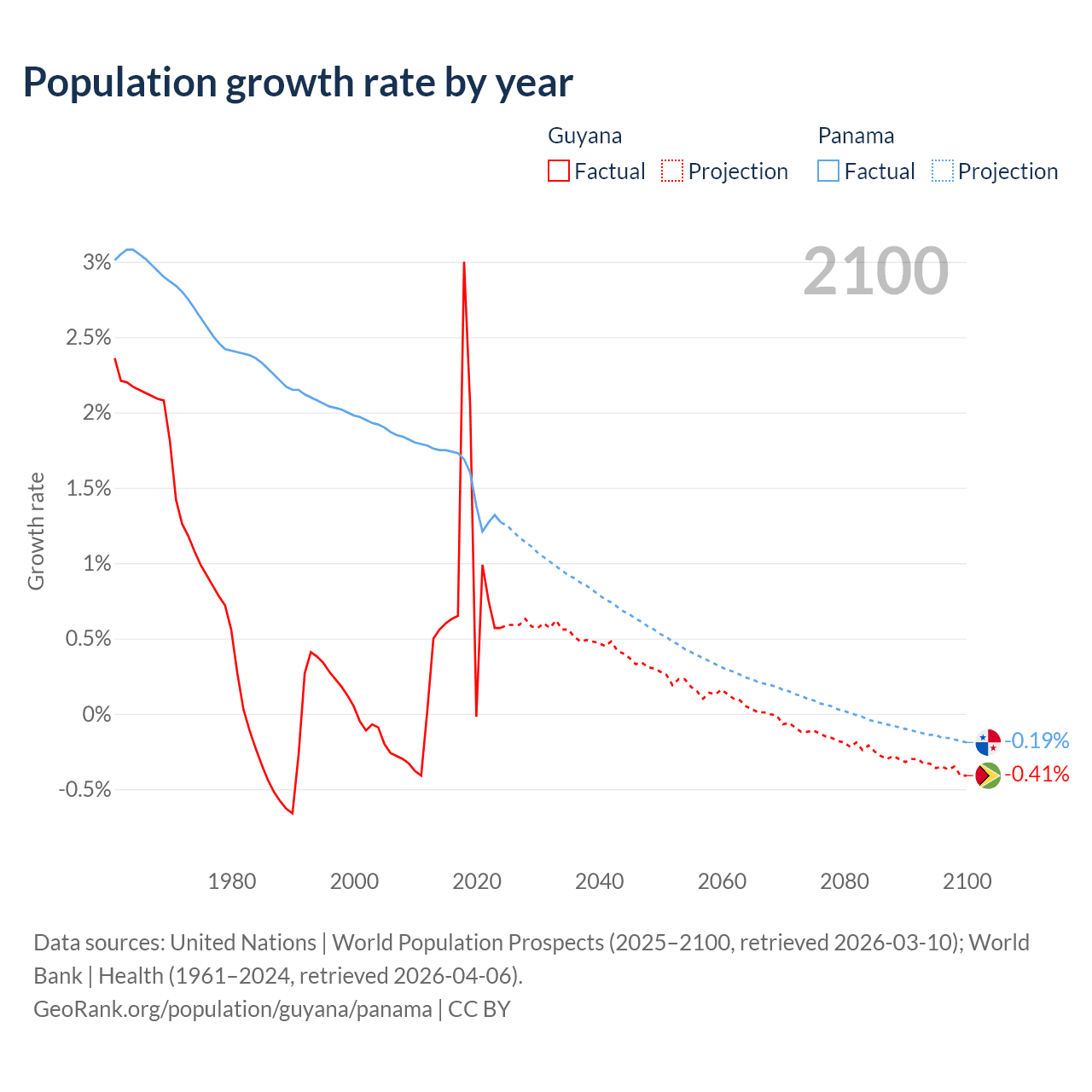 - For the last 10 years, Guyana has had an average growth rate of +0.94% per year vs +1.52% in Panama.