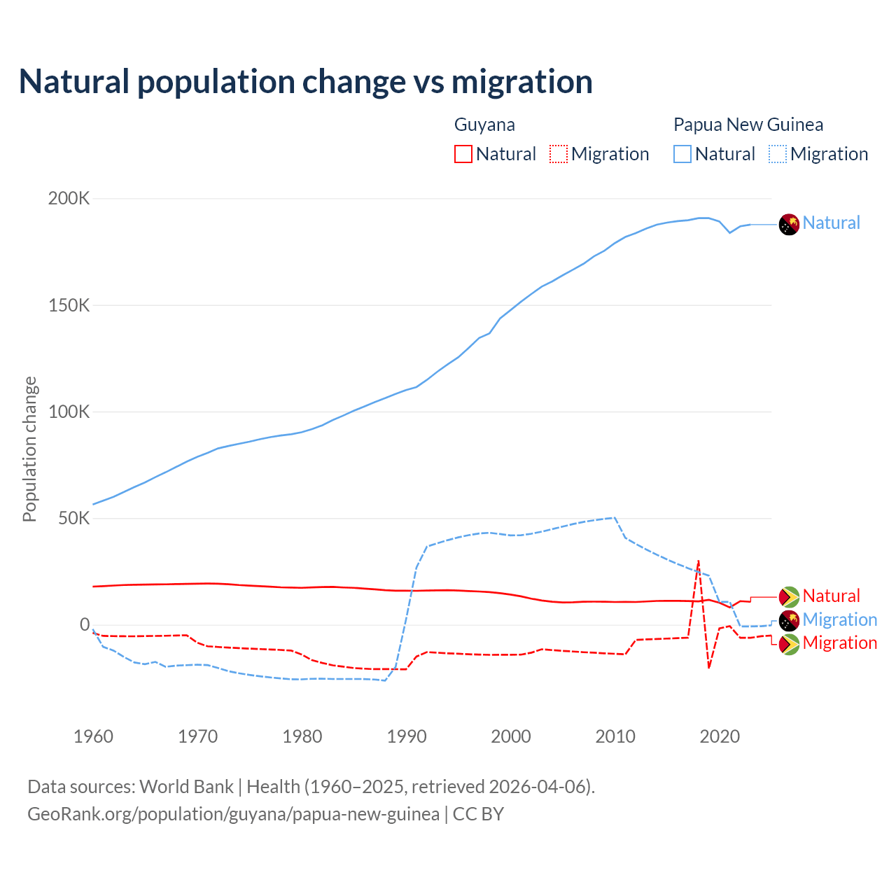 Over the last 10 years, 77.7% of the population change in Guyana is from natural causes (a gain of 107,419 people) and 22.3% is from migration (a loss of 30,797 people). In Papua New Guinea 91% is from natural causes (a gain of 1,883,906 people) and 8.98% is from migration (a gain of 185,900 people).