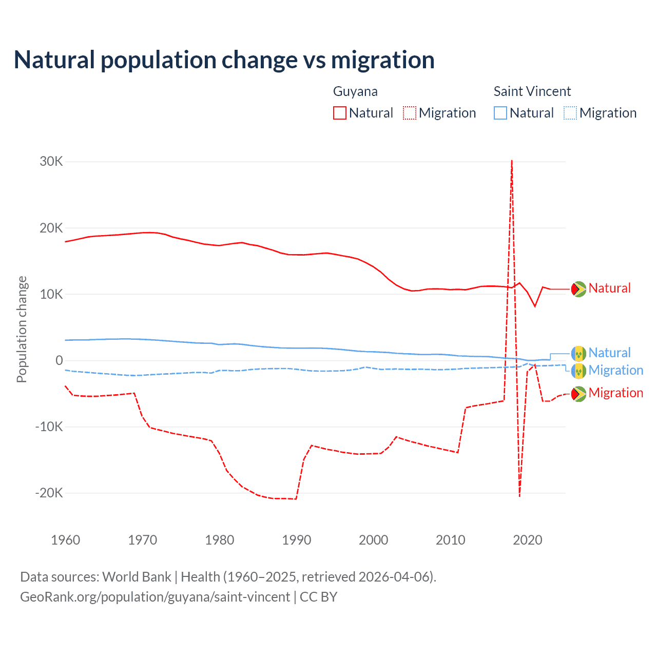 Over the last 10 years, 77.7% of the population change in Guyana is from natural causes (a gain of 107,419 people) and 22.3% is from migration (a loss of 30,797 people). In Saint Vincent 21.2% is from natural causes (a gain of 2,525 people) and 78.8% is from migration (a loss of 9,393 people).