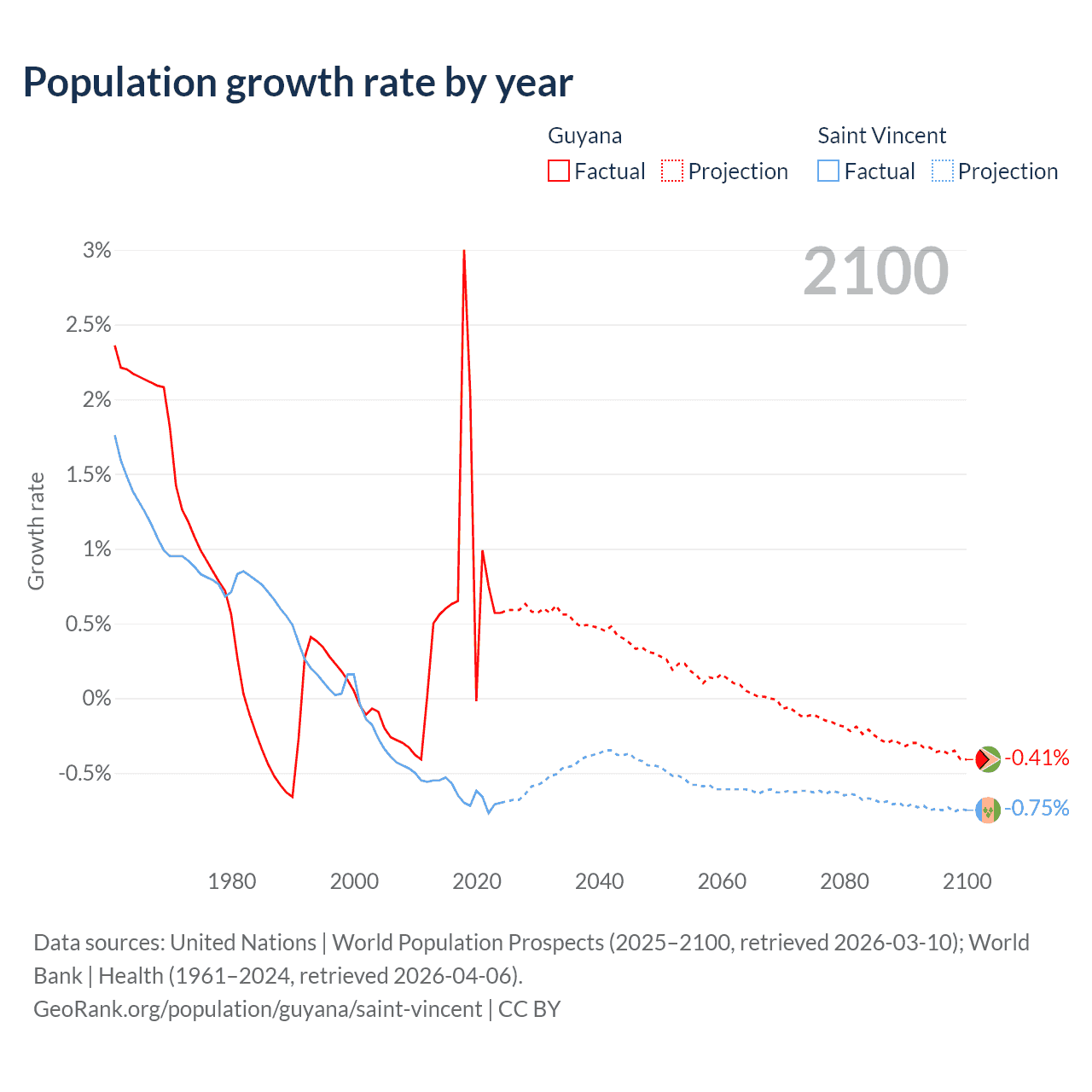 - For the last 10 years, Guyana has had an average growth rate of +0.94% per year vs -0.65% in Saint Vincent.