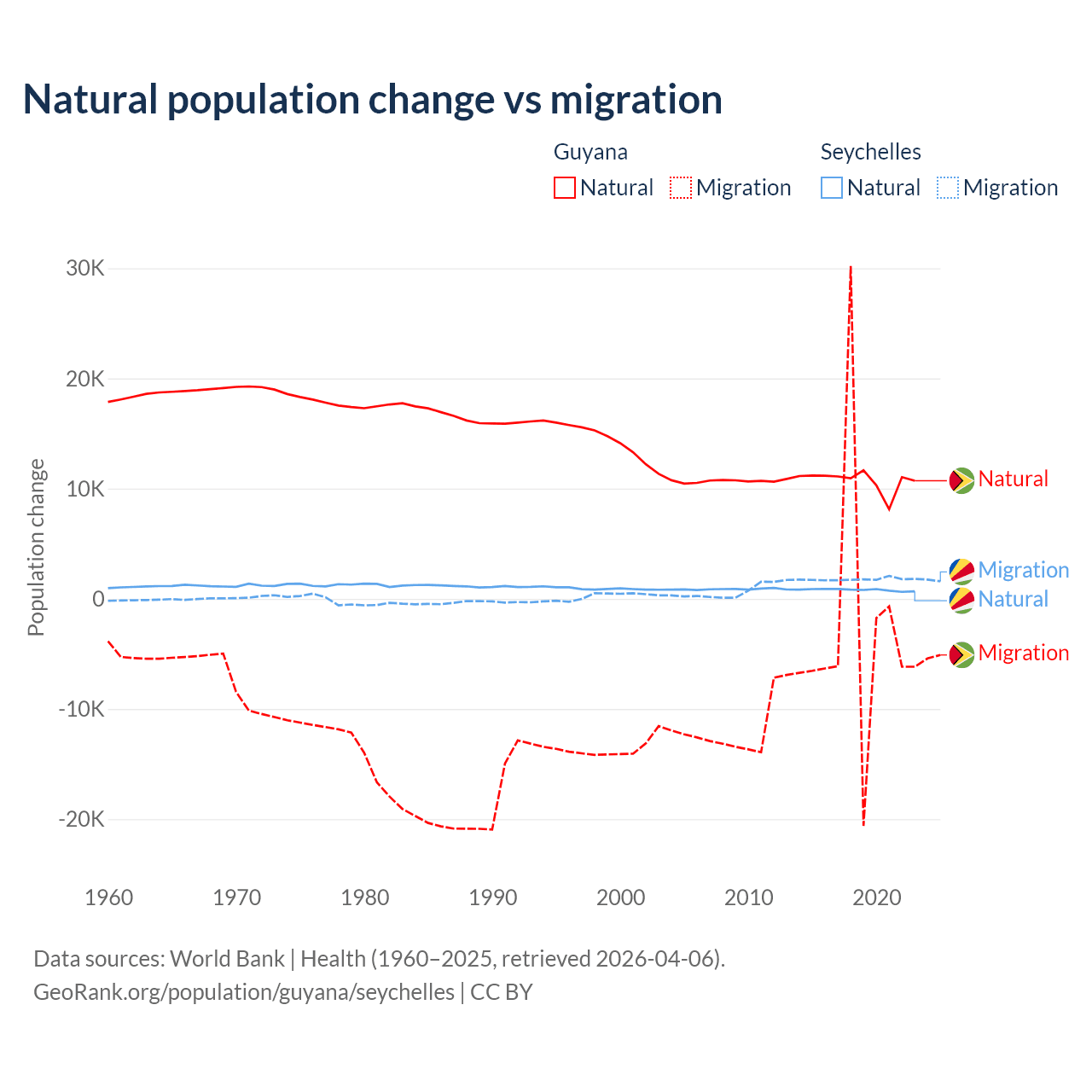 Over the last 10 years, 77.7% of the population change in Guyana is from natural causes (a gain of 107,419 people) and 22.3% is from migration (a loss of 30,797 people). In the Seychelles 31.4% is from natural causes (a gain of 8,122 people) and 68.6% is from migration (a gain of 17,748 people).