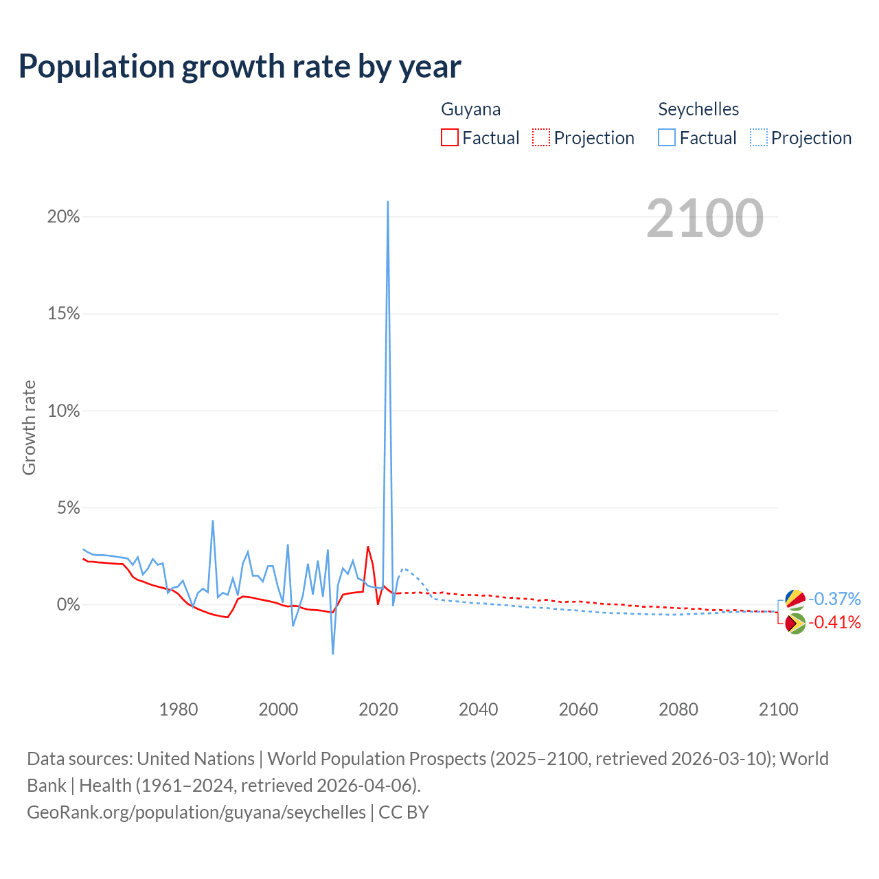 - Since 2006, the population of Guyana has increased from 759K people to 842K (11% growth), while the Seychelles has grown from 84.6K to 126K (49.3% growth).
