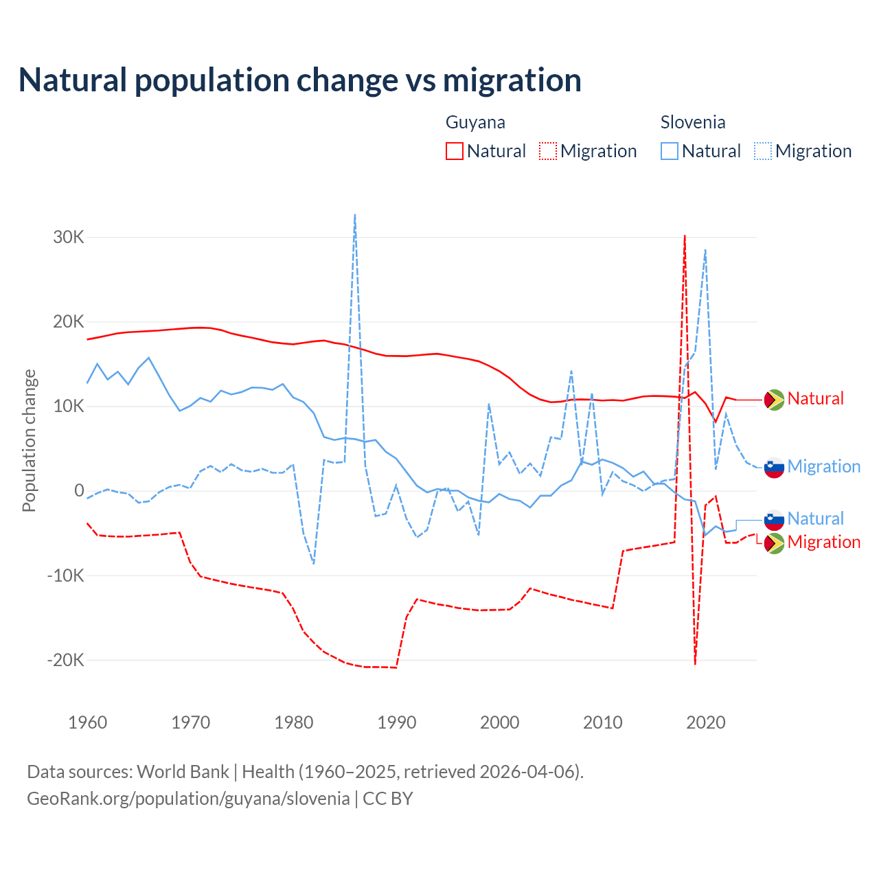 Over the last 10 years, 77.7% of the population change in Guyana is from natural causes (a gain of 107,419 people) and 22.3% is from migration (a loss of 30,797 people). In Slovenia 18.1% is from natural causes (a loss of 17,573 people) and 81.9% is from migration (a gain of 79,532 people).