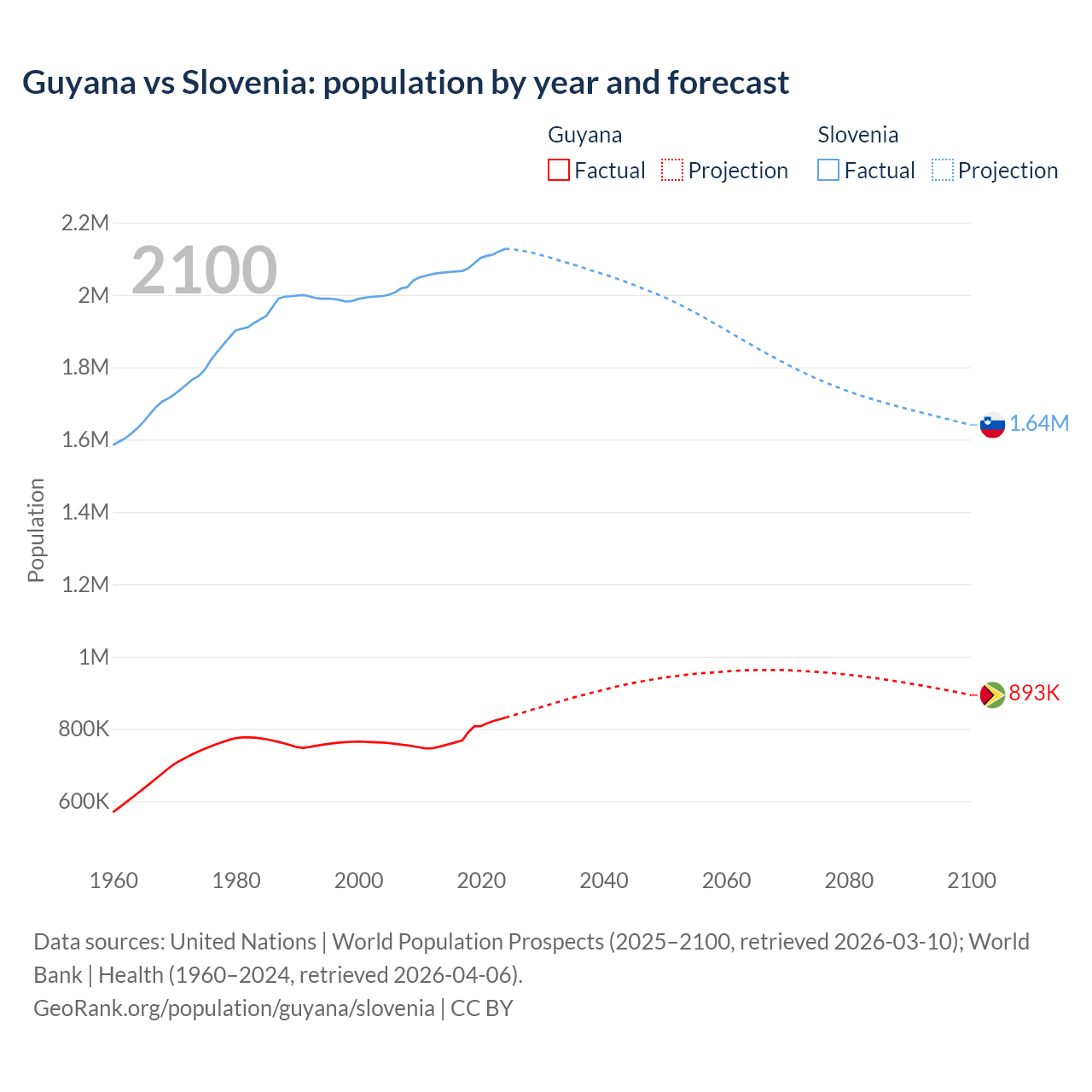 The latest officially reported population of Guyana was 831,087 in 2024 vs 2,127,400 people in Slovenia in 2024. In 2026, based on the adjusted UN estimation, the current Guyana's population is 842,249 people compared to 2,124,138 in Slovenia.