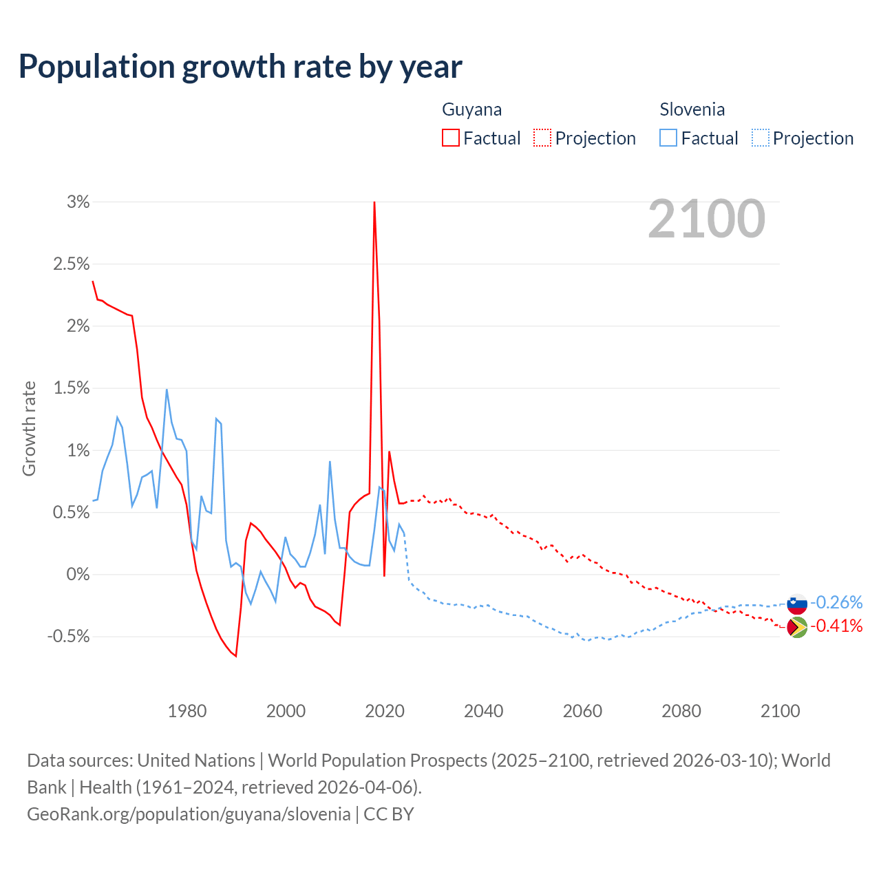 - For the last 10 years, Guyana has had an average growth rate of +0.94% per year vs +0.29% in Slovenia.