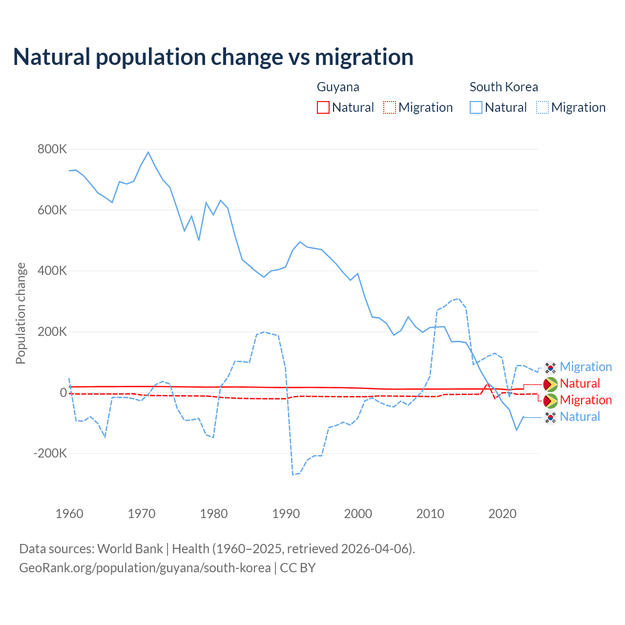Over the last 10 years, 77.7% of the population change in Guyana is from natural causes (a gain of 107,419 people) and 22.3% is from migration (a loss of 30,797 people). In South Korea 17.6% is from natural causes (a gain of 277,215 people) and 82.4% is from migration (a gain of 1,298,356 people).