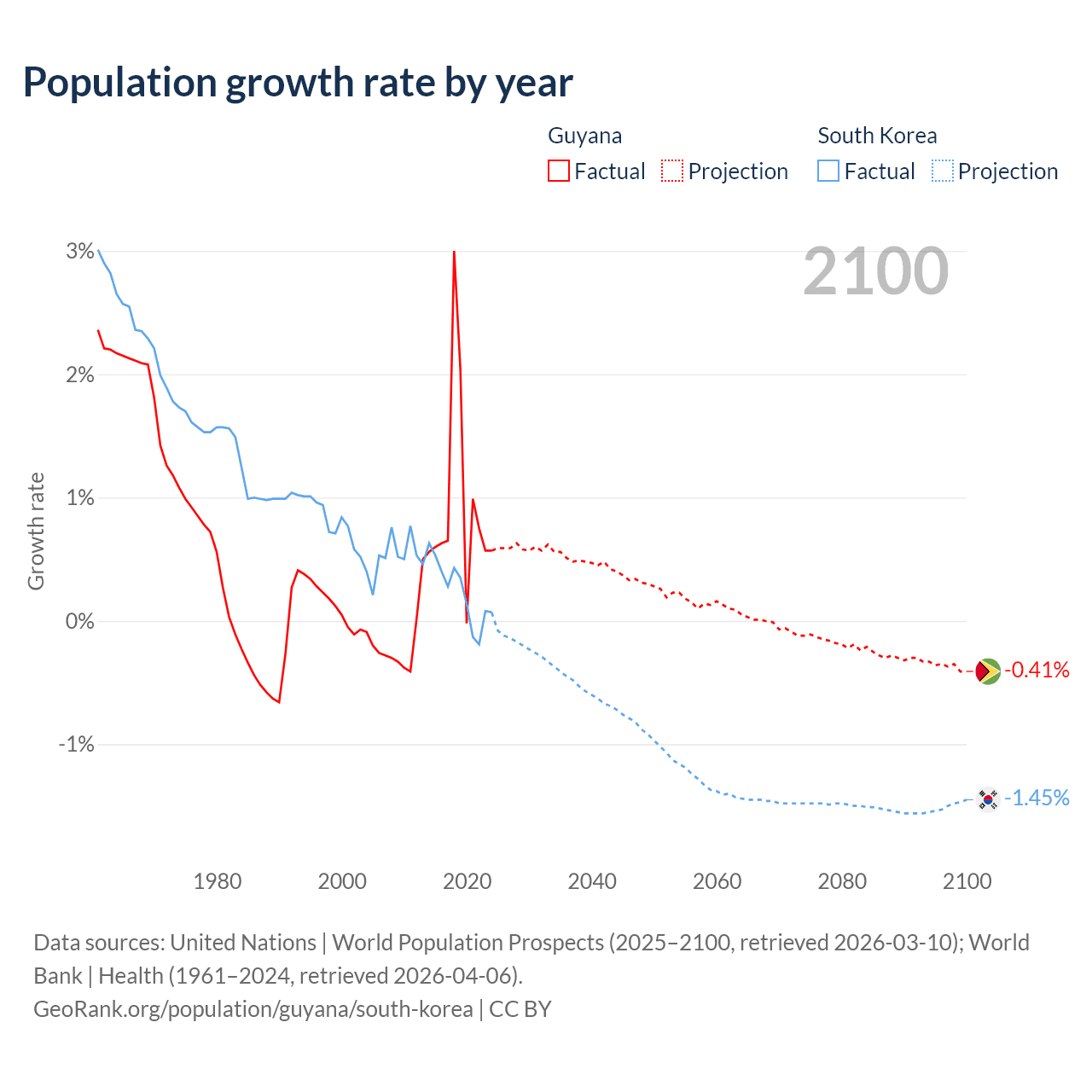 - For the last 10 years, Guyana has had an average growth rate of +0.94% per year vs +0.24% in South Korea.