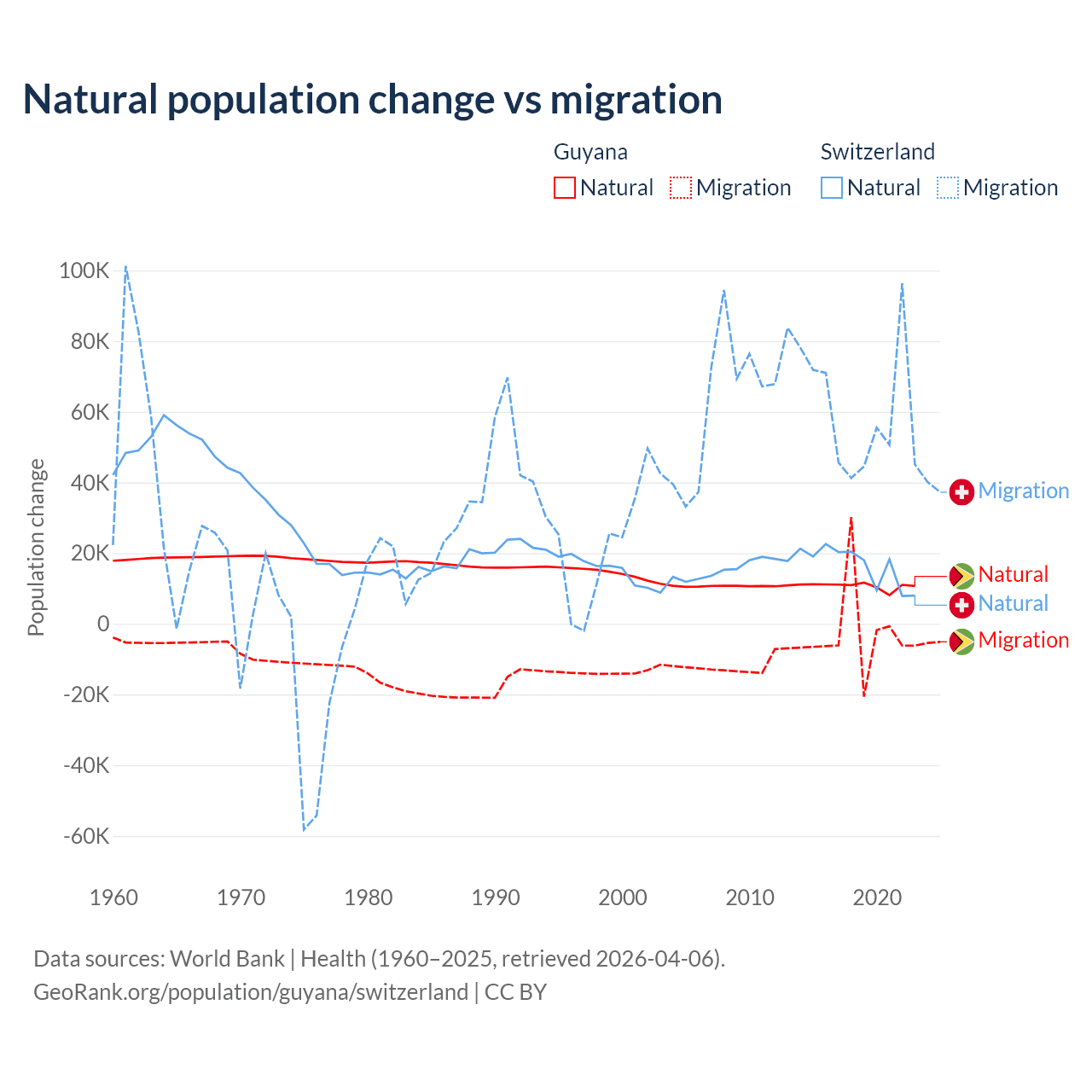 Over the last 10 years, 77.7% of the population change in Guyana is from natural causes (a gain of 107,419 people) and 22.3% is from migration (a loss of 30,797 people). In Switzerland 21.6% is from natural causes (a gain of 165,354 people) and 78.4% is from migration (a gain of 600,145 people).