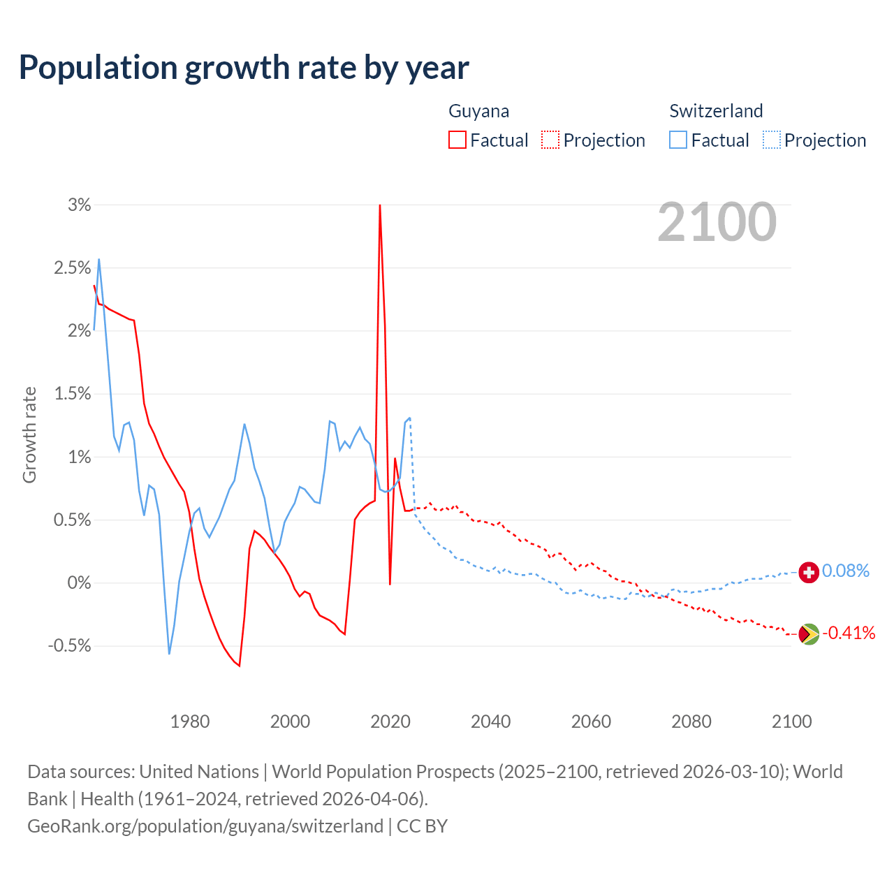 - For the last 10 years, Guyana has had an average growth rate of +0.94% per year vs +0.98% in Switzerland.