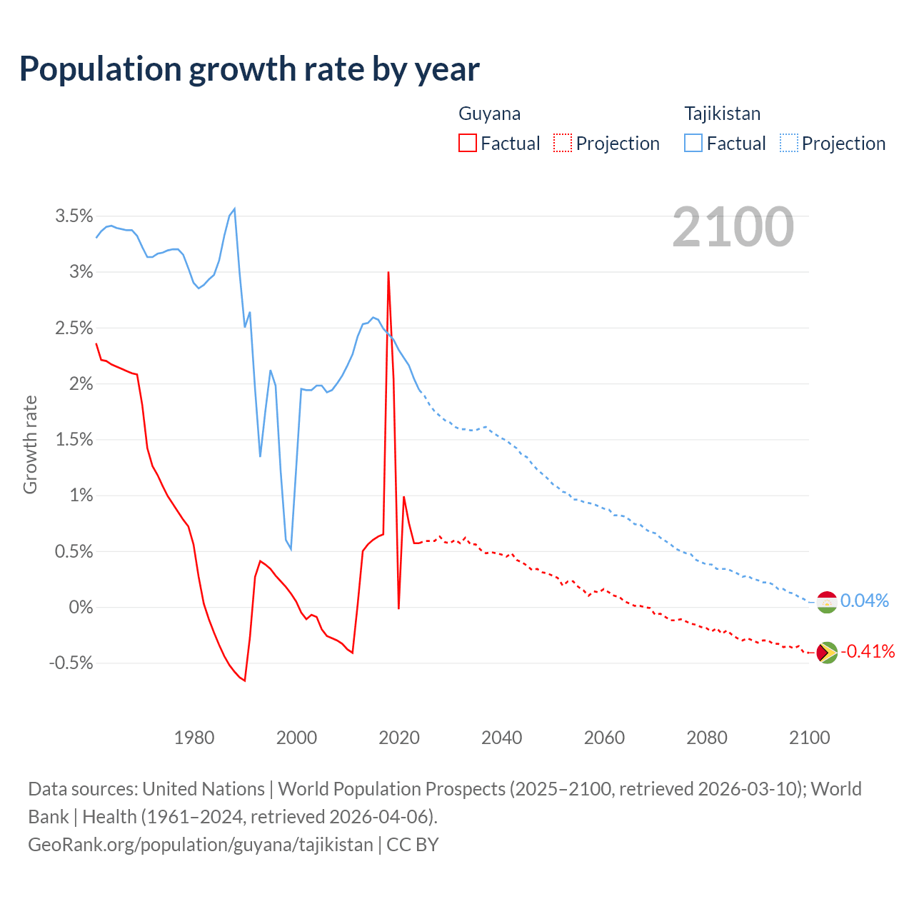 - For the last 10 years, Guyana has had an average growth rate of +0.94% per year vs +2.33% in Tajikistan.