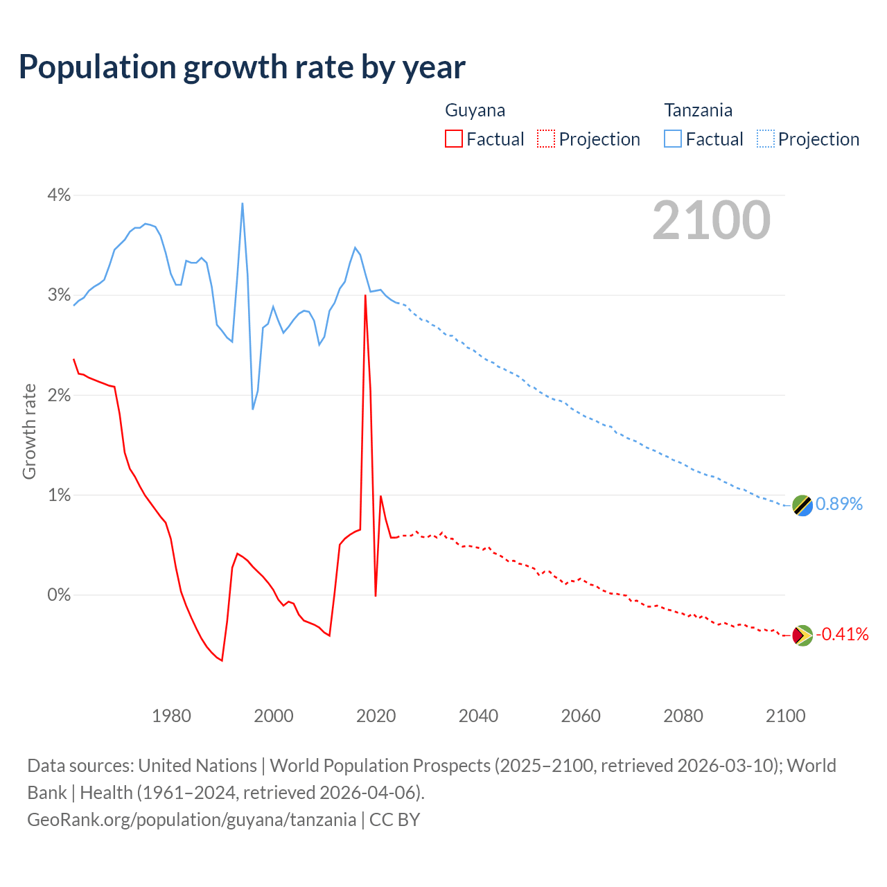 - For the last 10 years, Guyana has had an average growth rate of +0.94% per year vs +3.13% in Tanzania.