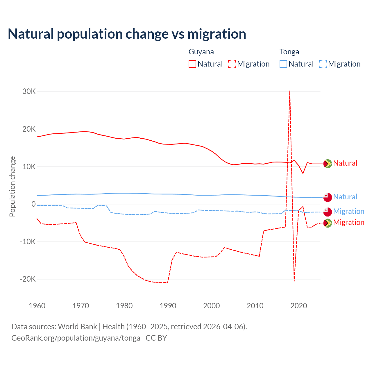 Over the last 10 years, 77.7% of the population change in Guyana is from natural causes (a gain of 107,419 people) and 22.3% is from migration (a loss of 30,797 people). In Tonga 46.9% is from natural causes (a gain of 18,919 people) and 53.1% is from migration (a loss of 21,384 people).