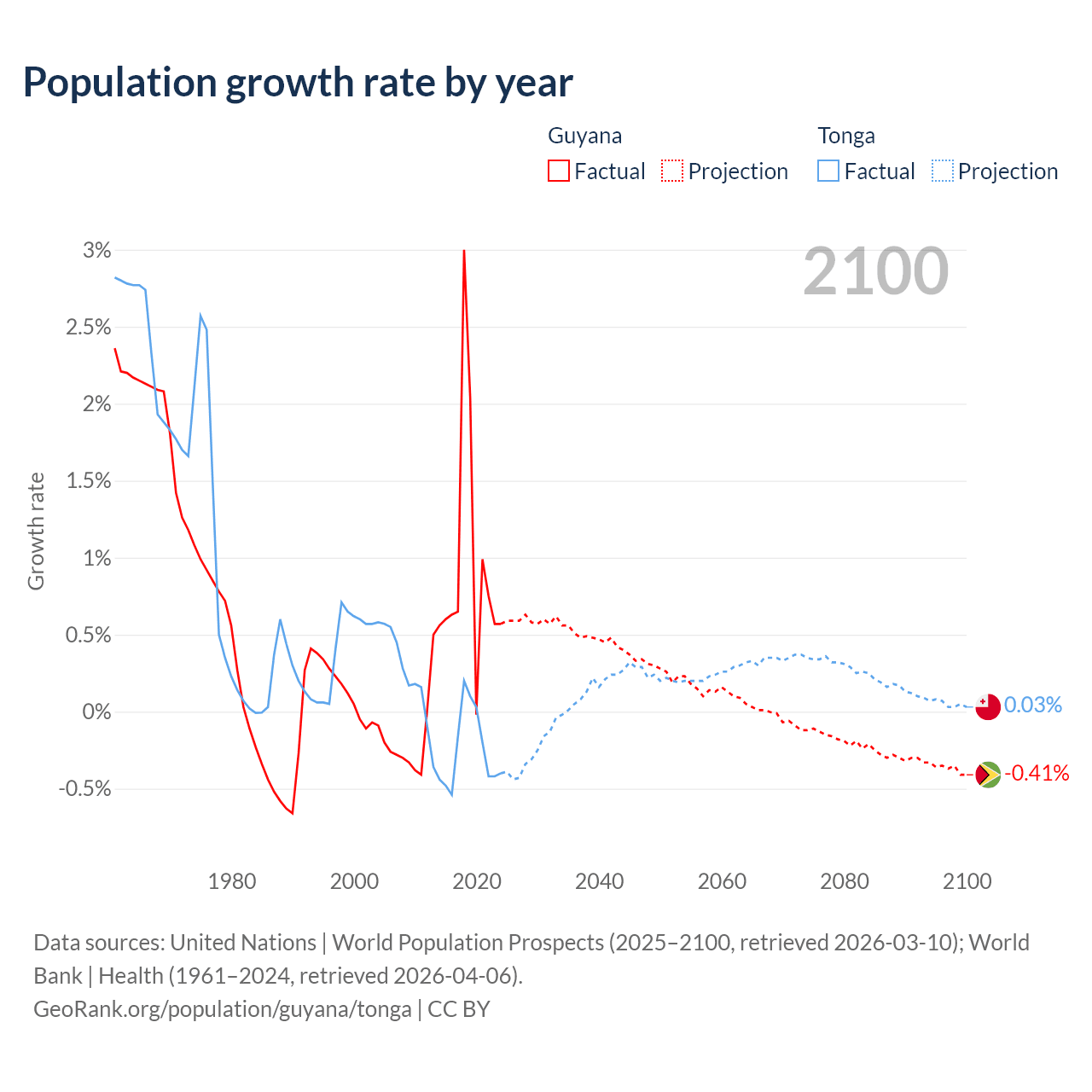 - For the last 10 years, Guyana has had an average growth rate of +0.94% per year vs -0.25% in Tonga.