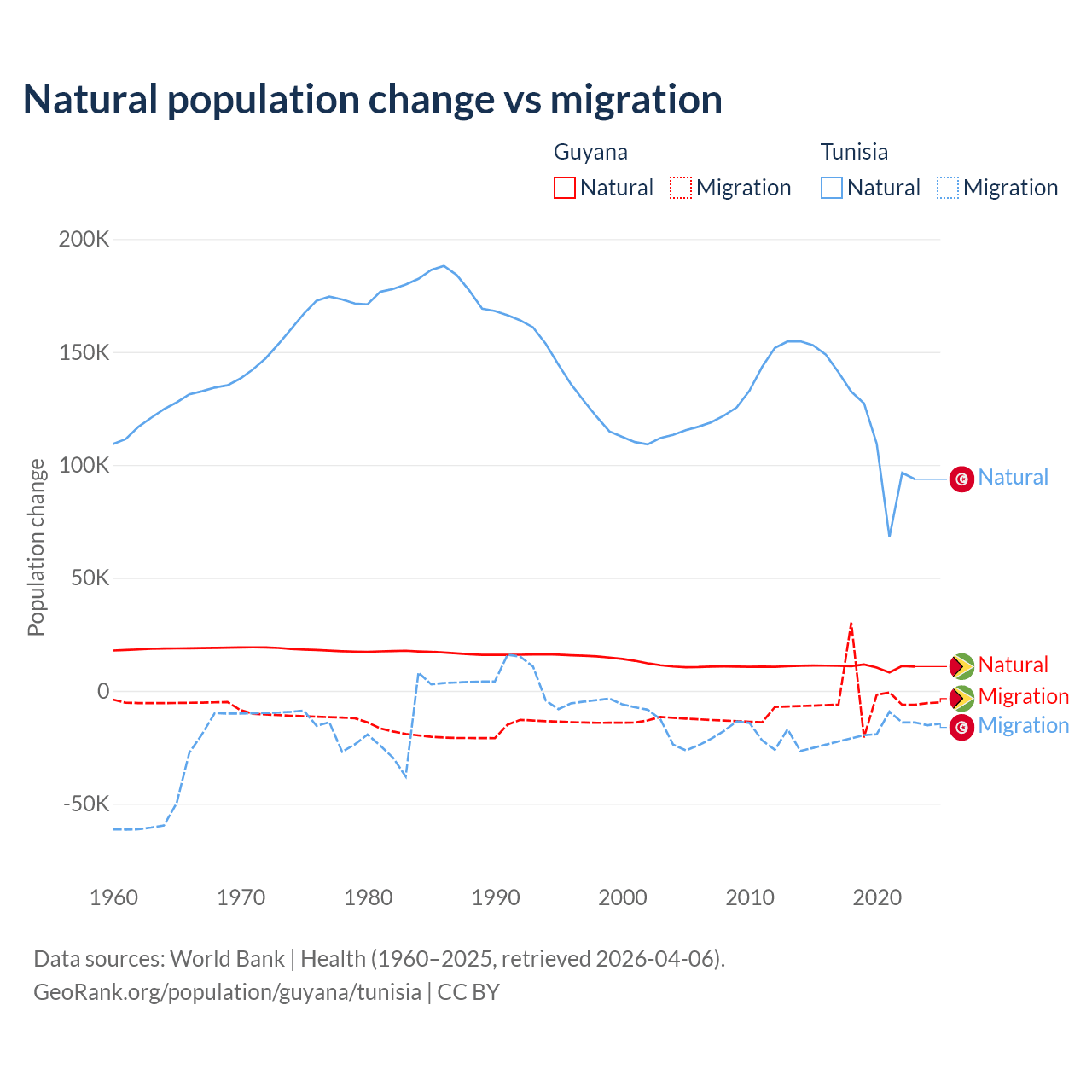Over the last 10 years, 77.7% of the population change in Guyana is from natural causes (a gain of 107,419 people) and 22.3% is from migration (a loss of 30,797 people). In Tunisia 86.3% is from natural causes (a gain of 1,225,079 people) and 13.7% is from migration (a loss of 195,011 people).