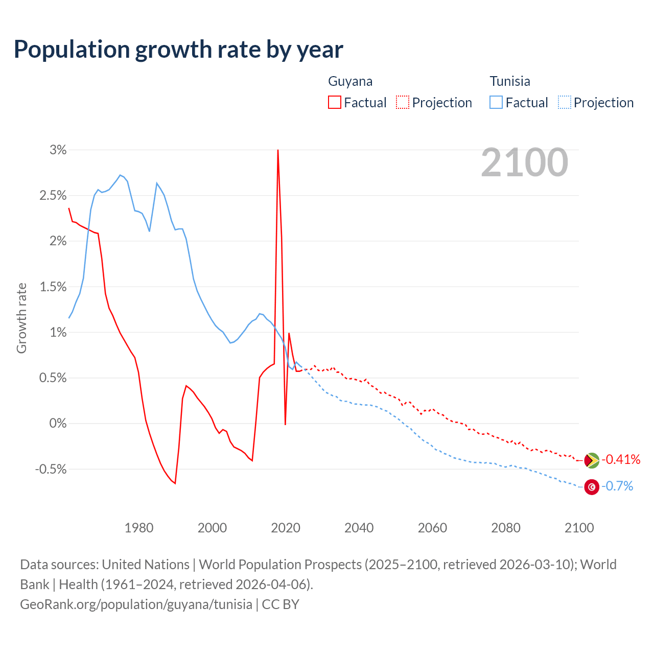 - For the last 10 years, Guyana has had an average growth rate of +0.94% per year vs +0.89% in Tunisia.