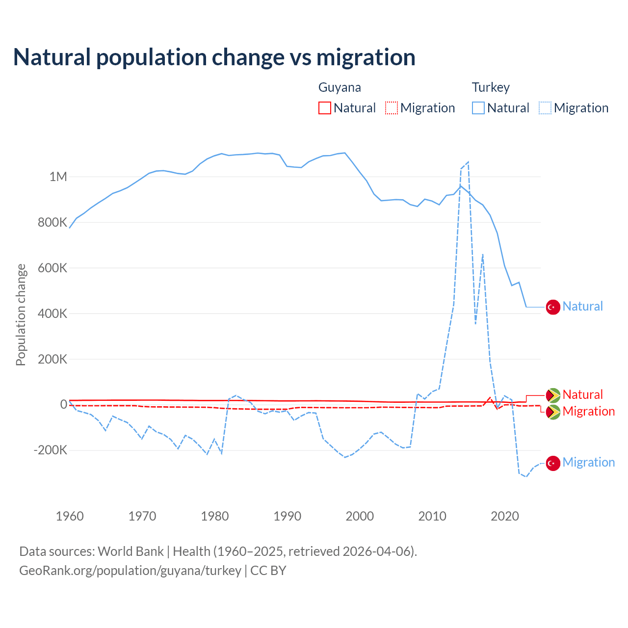 Over the last 10 years, 77.7% of the population change in Guyana is from natural causes (a gain of 107,419 people) and 22.3% is from migration (a loss of 30,797 people). In Turkey 73% is from natural causes (a gain of 7,333,352 people) and 27% is from migration (a gain of 2,718,916 people).