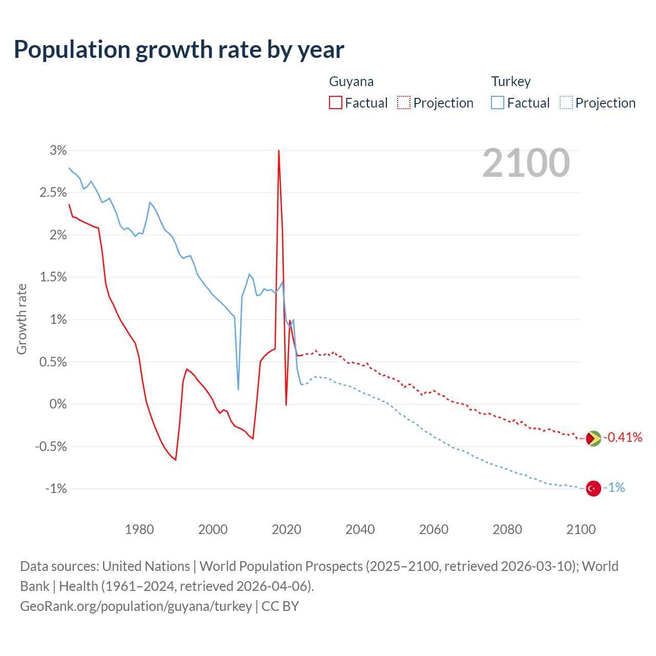 - For the last 10 years, Guyana has had an average growth rate of +0.94% per year vs +1.06% in Turkey.