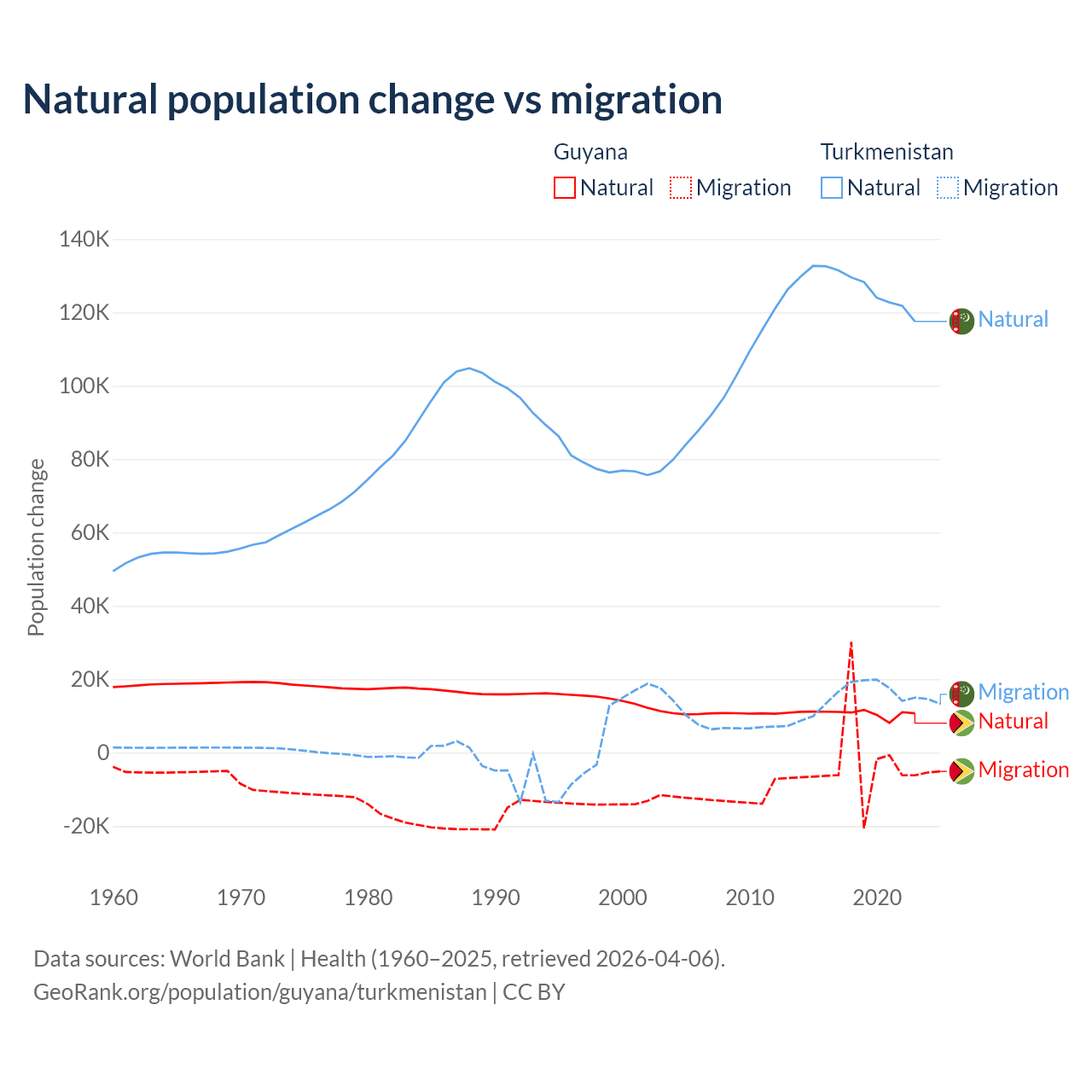 Over the last 10 years, 77.7% of the population change in Guyana is from natural causes (a gain of 107,419 people) and 22.3% is from migration (a loss of 30,797 people). In Turkmenistan 89.2% is from natural causes (a gain of 1,270,228 people) and 10.8% is from migration (a gain of 154,379 people).