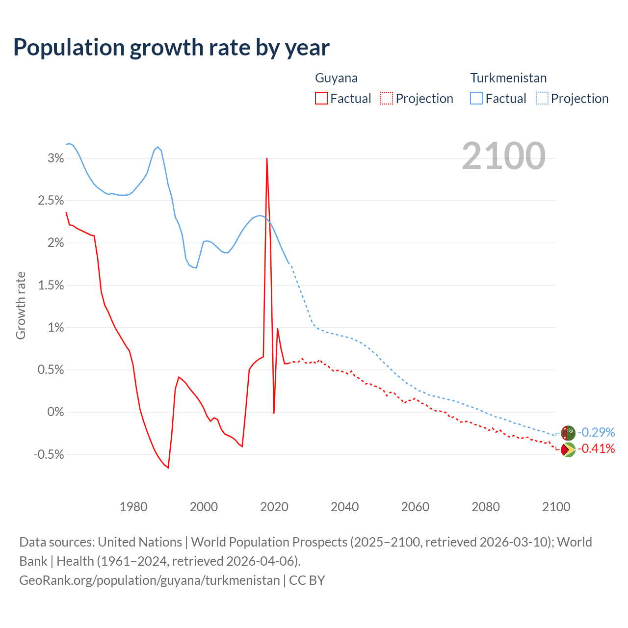 - For the last 10 years, Guyana has had an average growth rate of +0.94% per year vs +2.14% in Turkmenistan.