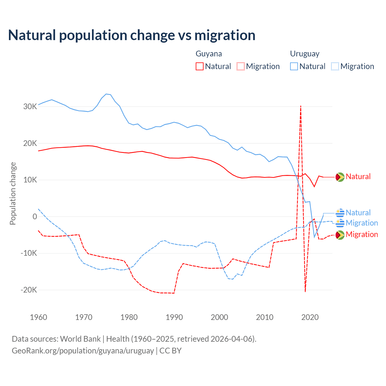 Over the last 10 years, 77.7% of the population change in Guyana is from natural causes (a gain of 107,419 people) and 22.3% is from migration (a loss of 30,797 people). In Uruguay 70% is from natural causes (a gain of 64,303 people) and 30% is from migration (a loss of 27,501 people).