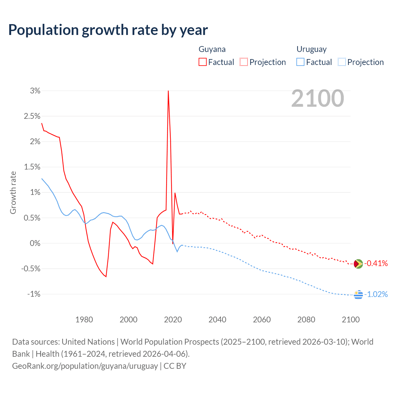 - For the last 10 years, Guyana has had an average growth rate of +0.94% per year vs +0.11% in Uruguay.